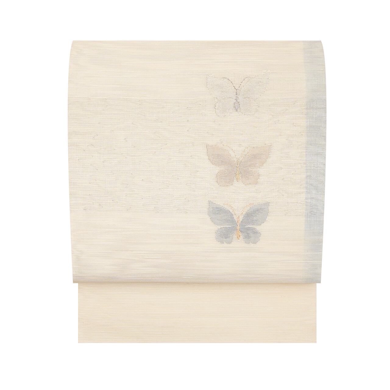 象牙色の張りのある緯糸で絽目に織られた地に、お太鼓には地銀通しで非常に薄く織られた段が取られ、右端には灰青色のボーダーが引かれて、その傍に単色の糸ですくい織で織られた可愛らしい蝶々が並んでいるといった、どこか儚げな雰囲気が魅力的な夏の八寸名古屋帯です。