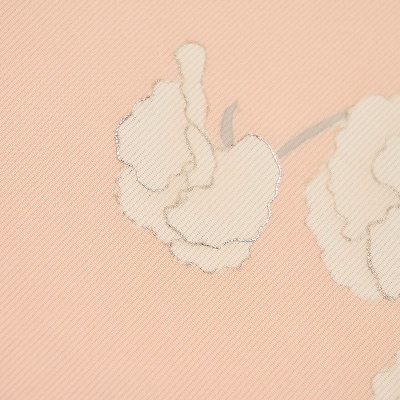 とても細かい絽目に織られた、品質の良い絽塩瀬のような生地が淡いピンク・灰梅色に染められて、お太鼓には可愛らしいスイートピーのお花が白く染め抜かれ、花のまわりには銀糸で手刺繍が施された、とても品の良い楚々とした雰囲気の夏の九寸の開名古屋帯です。