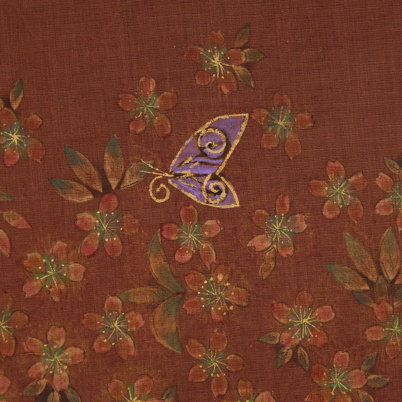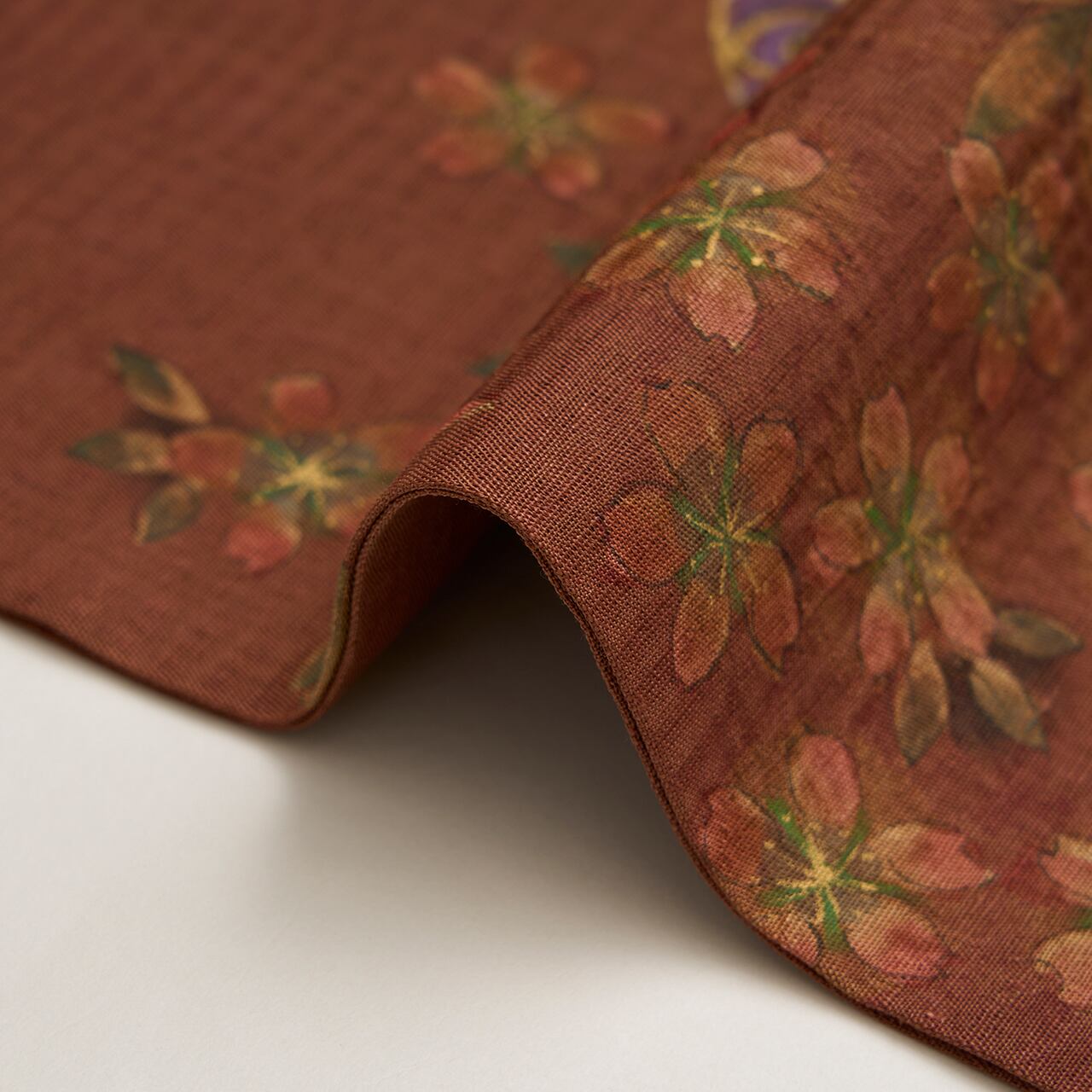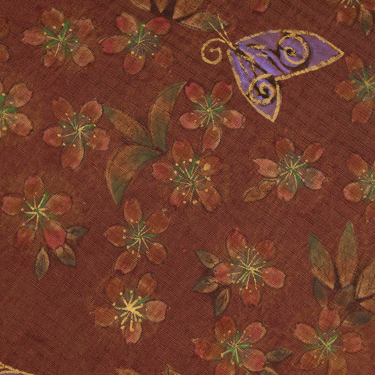小千谷の変り市松のような地模様のある麻の生地が赤味のあるこげ茶・紅檜皮色に染められ、お太鼓には桜のような可愛らしいお花がたくさん散らされて、ちょっとエキゾティックな雰囲気の蝶々が舞っている、楽しい図案の九寸名古屋帯です。