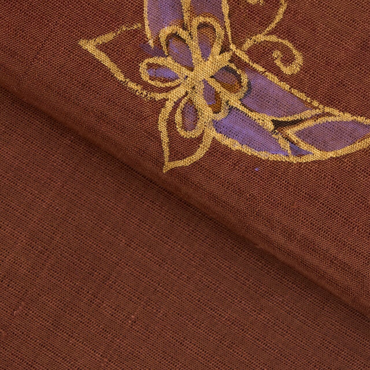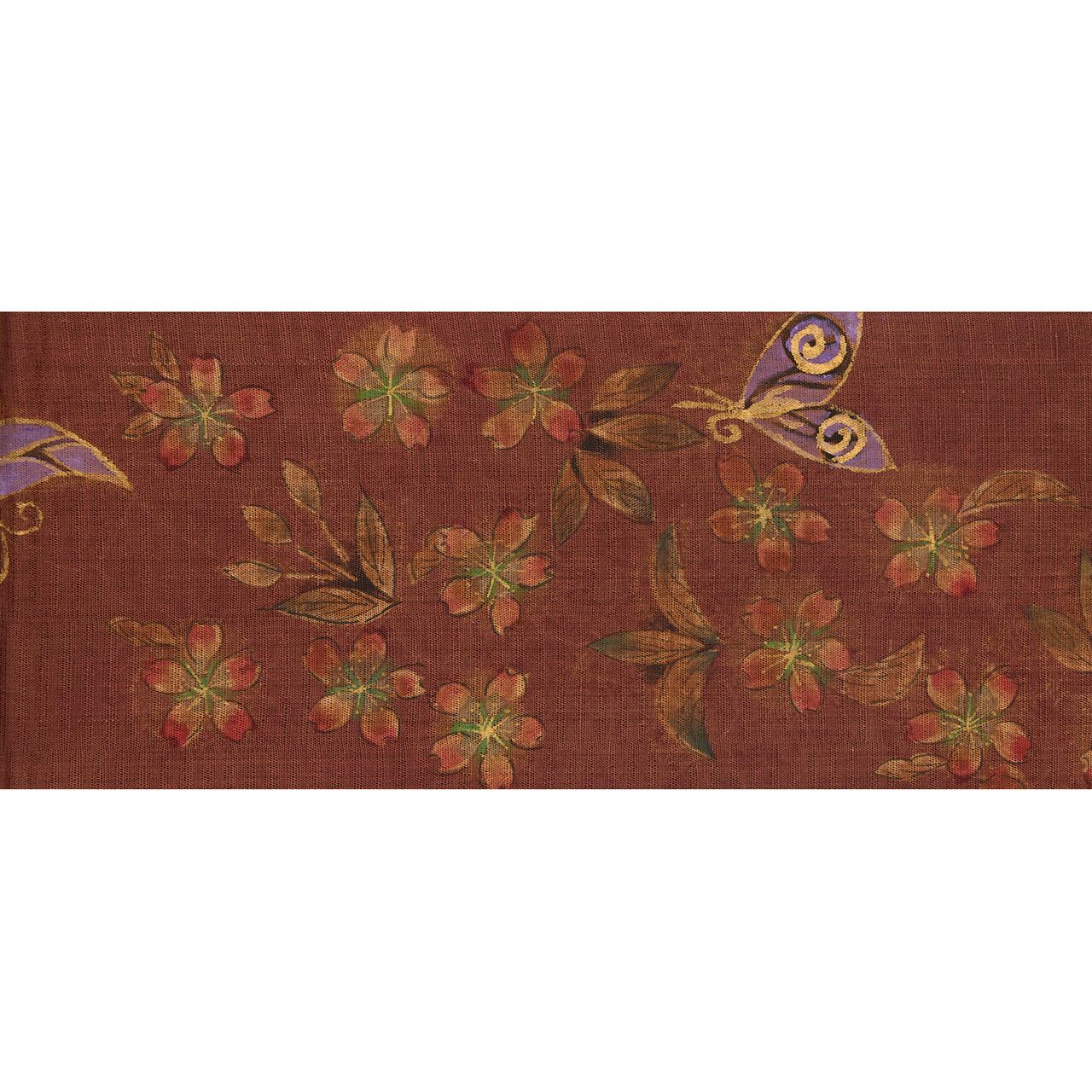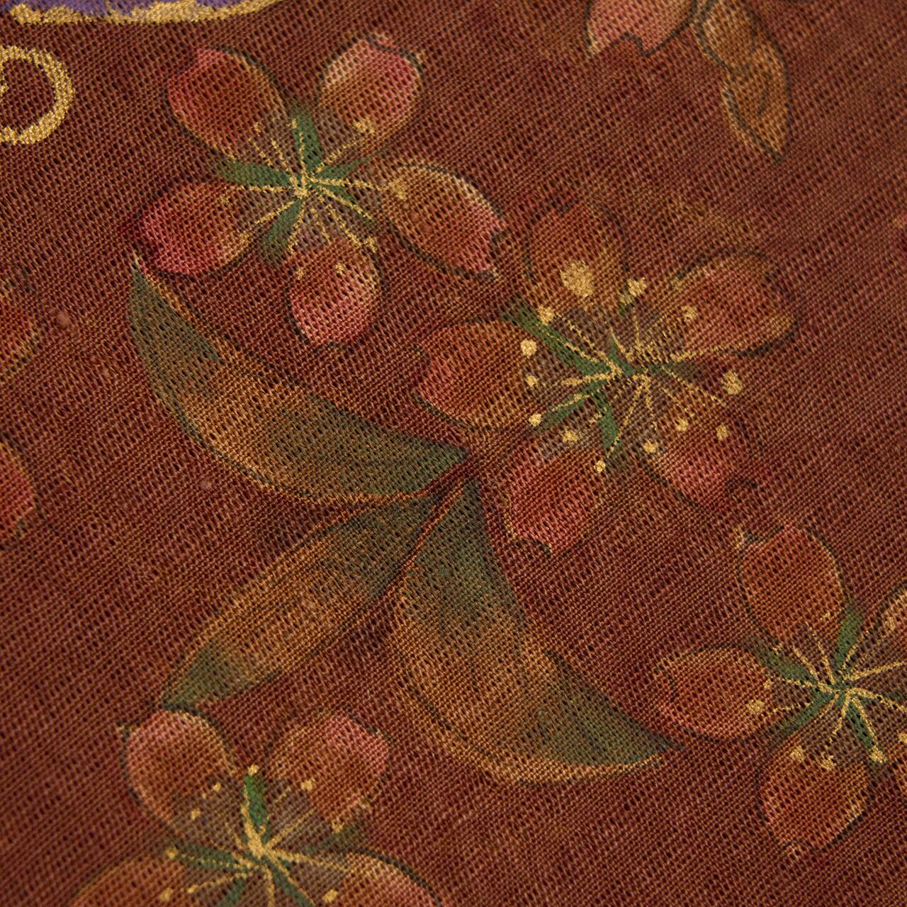 小千谷の変り市松のような地模様のある麻の生地が赤味のあるこげ茶・紅檜皮色に染められ、お太鼓には桜のような可愛らしいお花がたくさん散らされて、ちょっとエキゾティックな雰囲気の蝶々が舞っている、楽しい図案の九寸名古屋帯です。