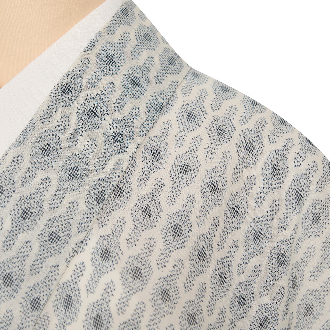 能登上布のさらりとした肌ざわりと、櫛押捺染という技法で柄付けされた精密で細やかな絣によって構成された模様は、とても涼やかな表情となっていて、着心地の良さが想像できるようです。