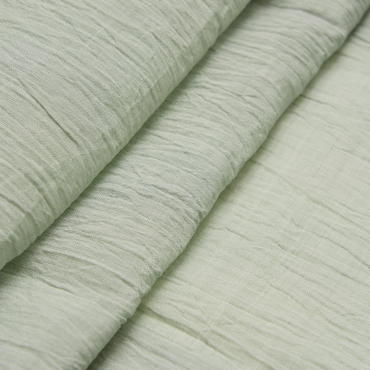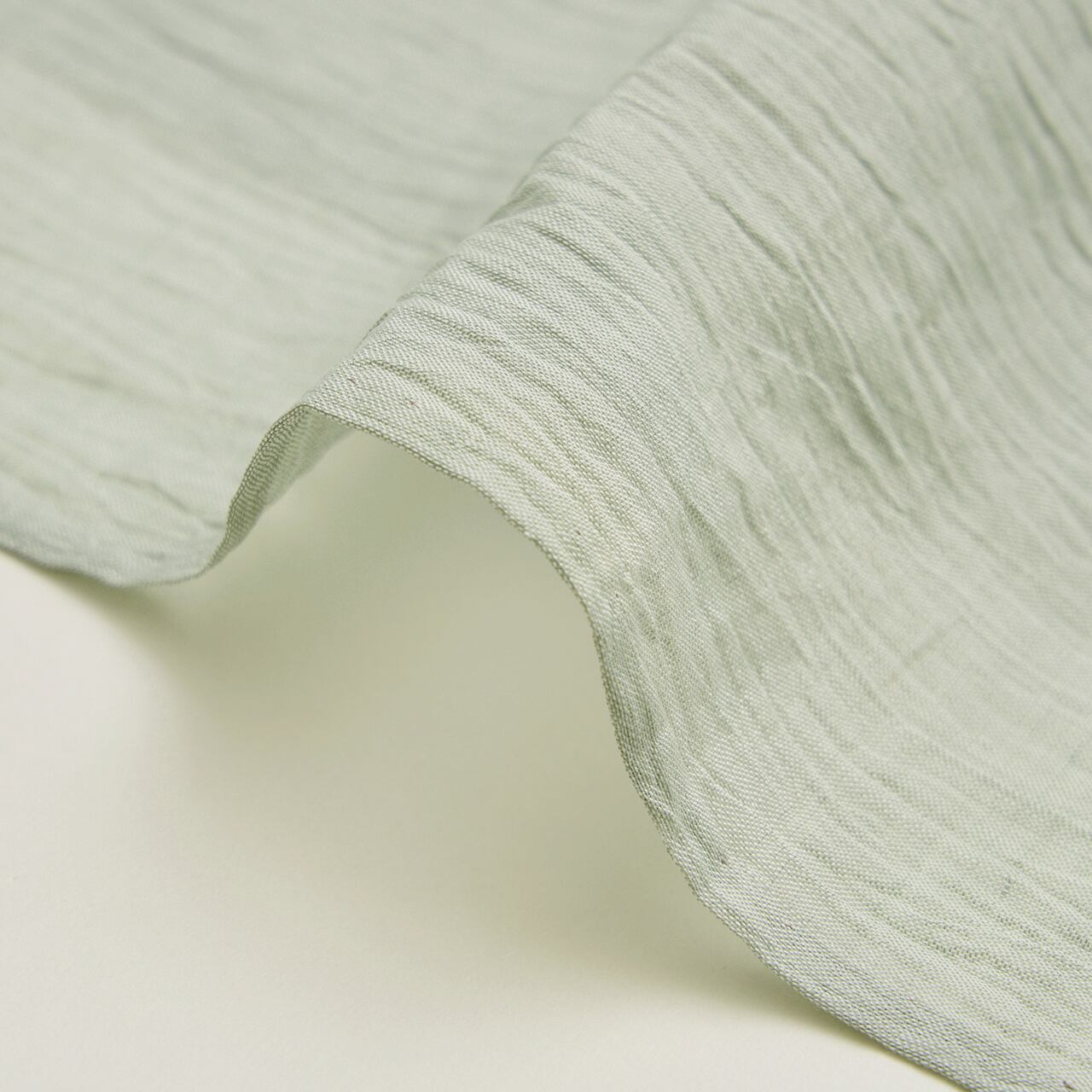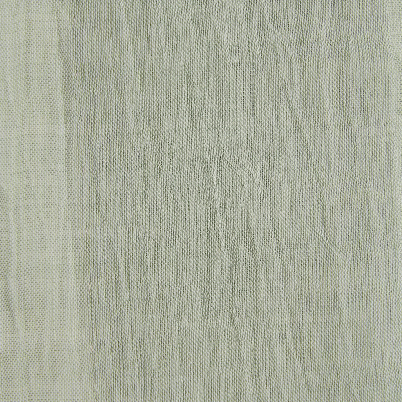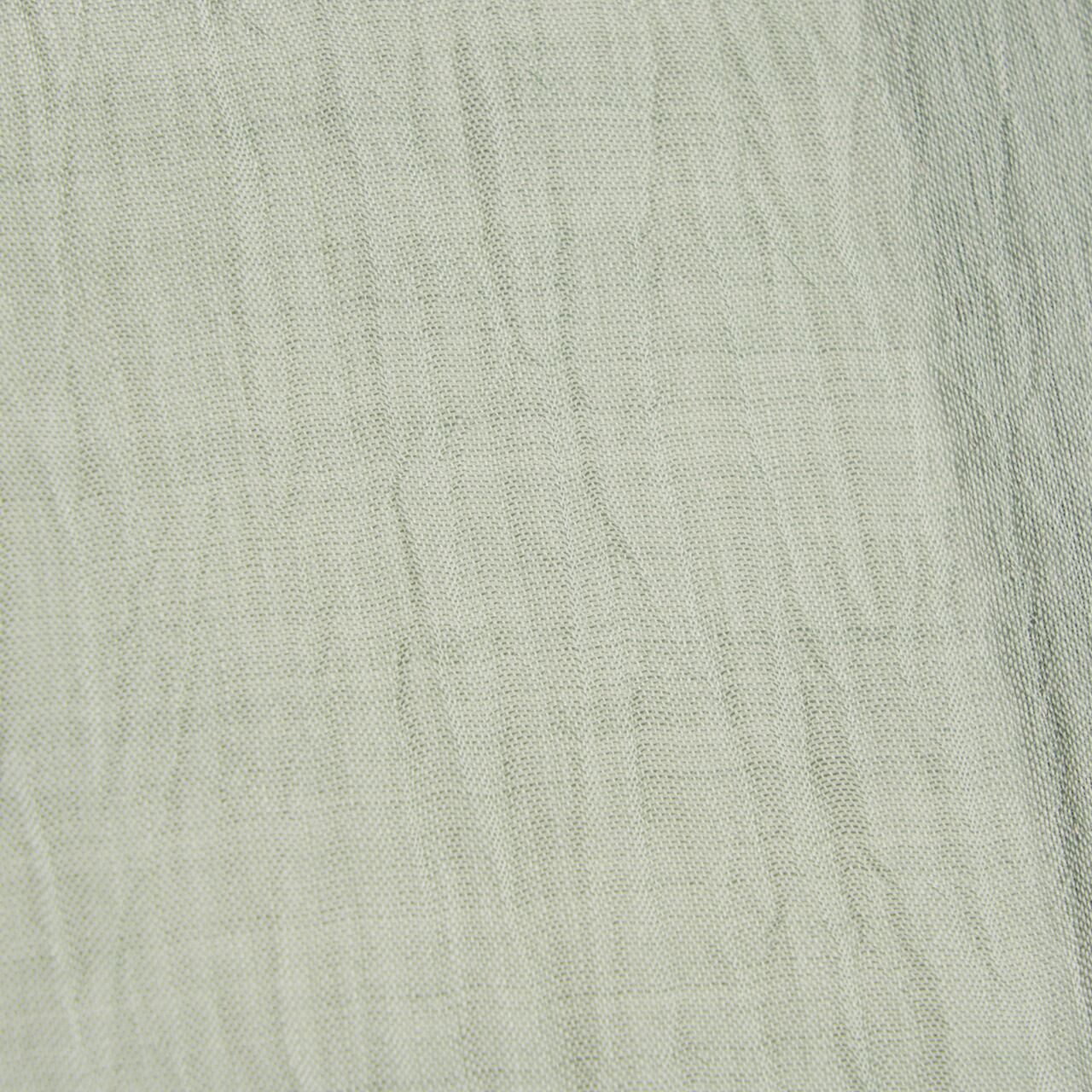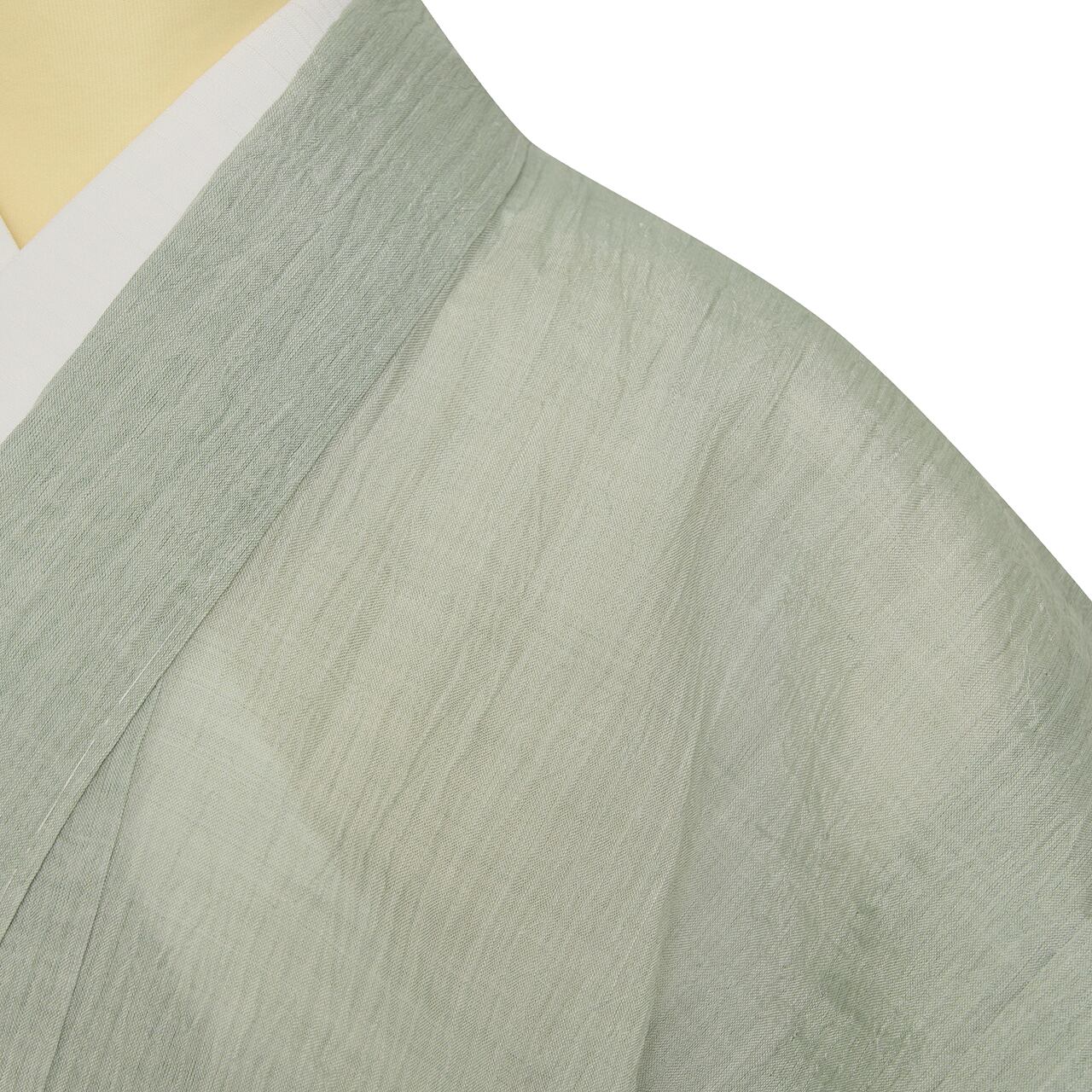 少しだけグレー味のある淡い青磁・錆青磁色の糸で、小千谷ちぢみならではのシボのある風合いに織られた、無地の麻の単衣のお着物です。
