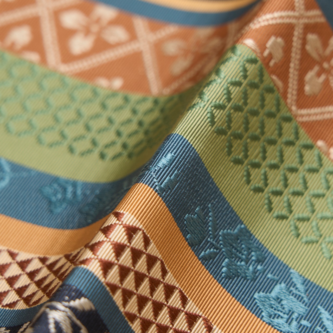 こちらは伝統工芸士・鬼丸勝秀さんの手によるものだそうで、非常に細やかにしっかりと、目を見張るようなたくさん模様を巧みに糸を操って織られていて、素敵な世界が広がっています。