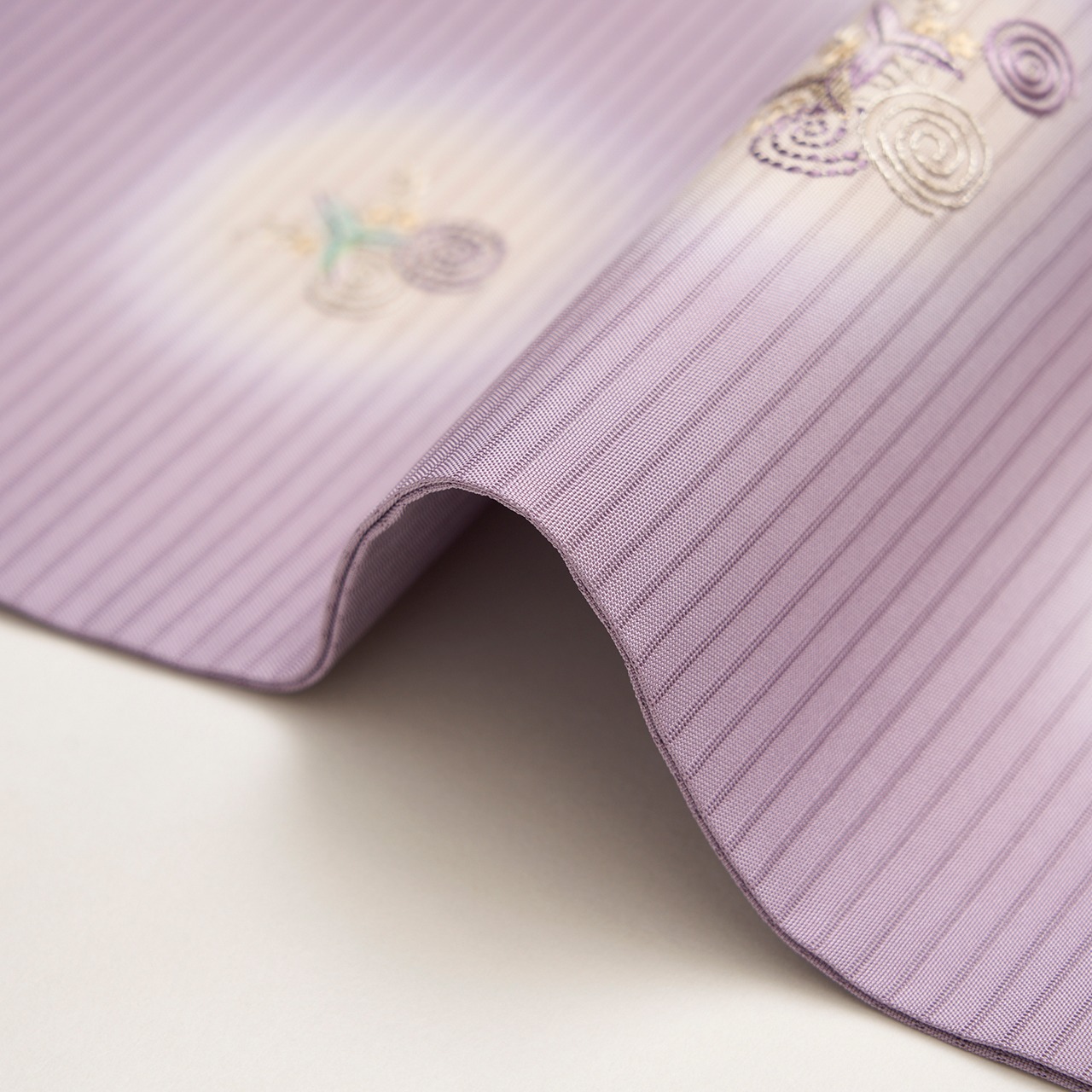 清涼感がありながらも、程よい華やかさの感じられる浅紫色の地色がとても綺麗で、灰白色の暈しが染め抜かれているのもお洒落な雰囲気となっています。