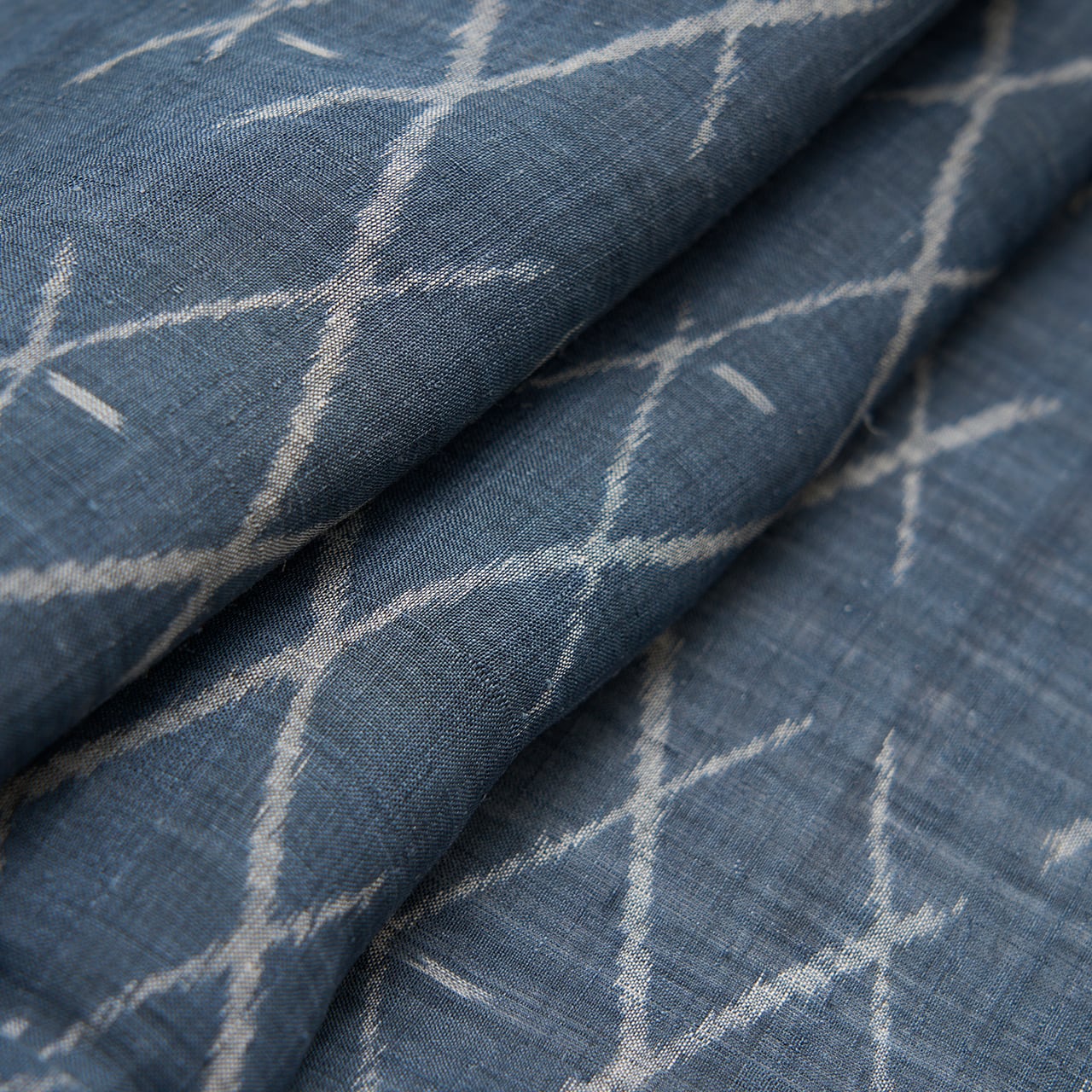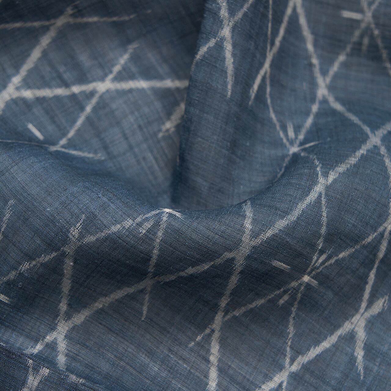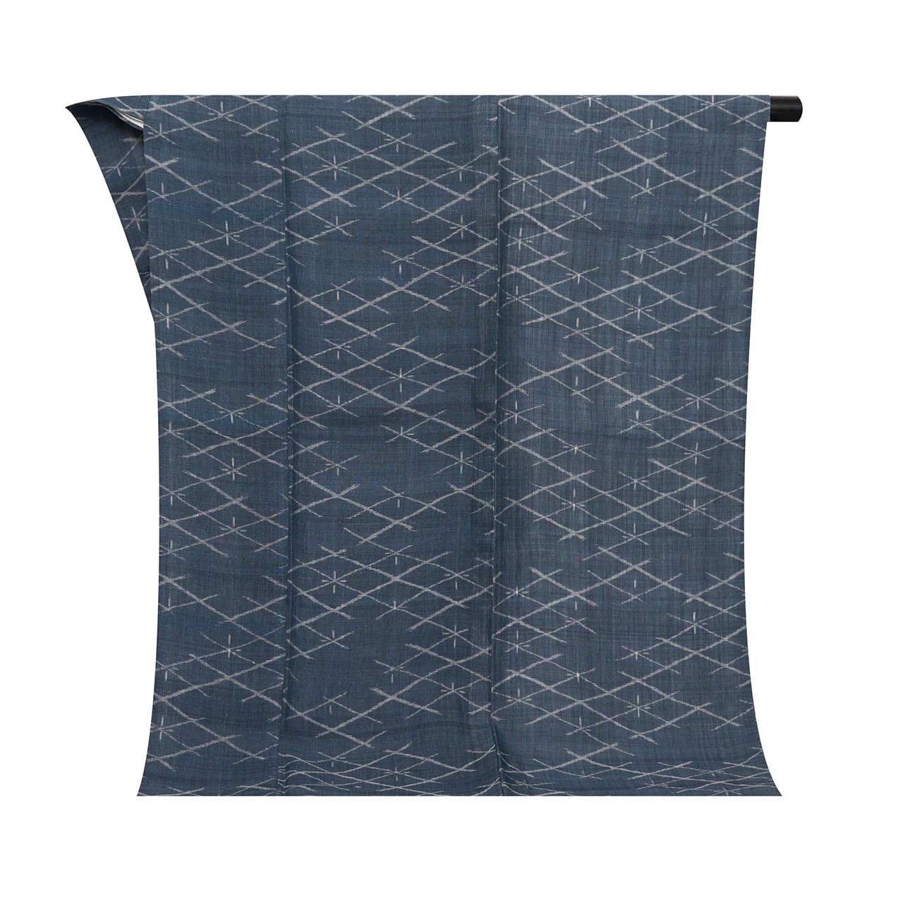 こちらはグレー味のある淡い藍色の地に、藤色がかったグレー・桔梗鼠色の武田菱の絣がランダムに配置された、鈴木苧紡庵さん作の重要無形文化財越後上布のお着物です。