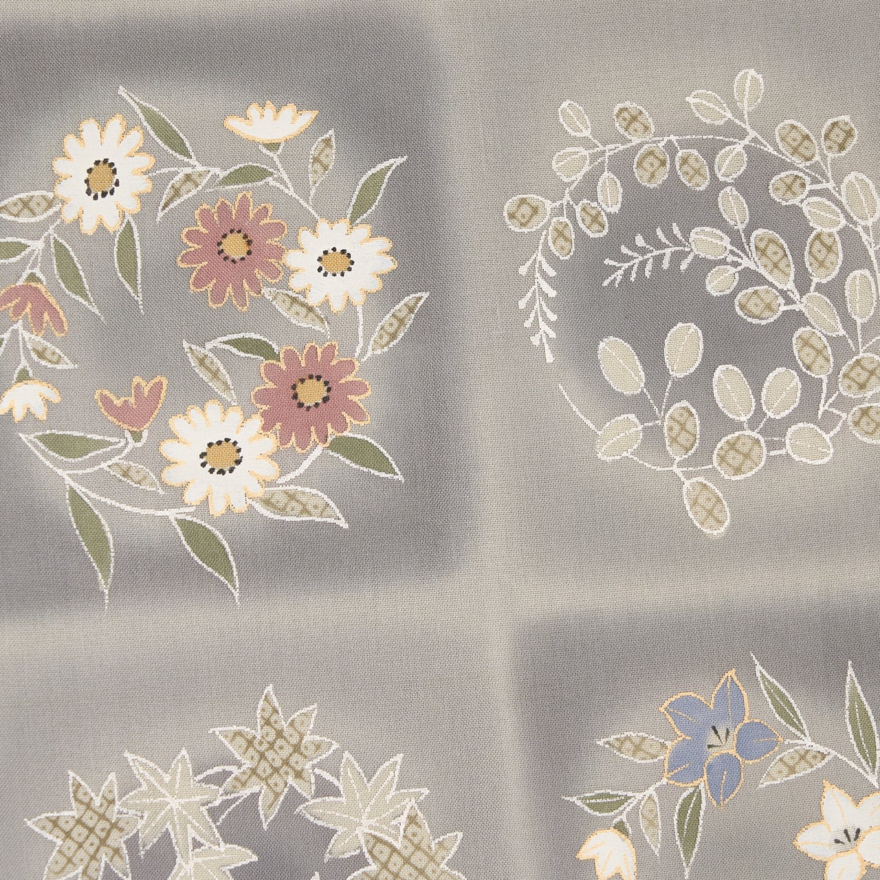 淡く明るめの綺麗なグレー・絹鼠色の紗の生地のお太鼓に大きく四角が取られ、薄墨色と鈍色が市松の配置に染められ、野菊や桔梗、萩、紅葉といった秋草の模様が丸紋の形に友禅で描かれた、とても素敵な清涼感のある野口さんの夏の九寸名古屋帯です。