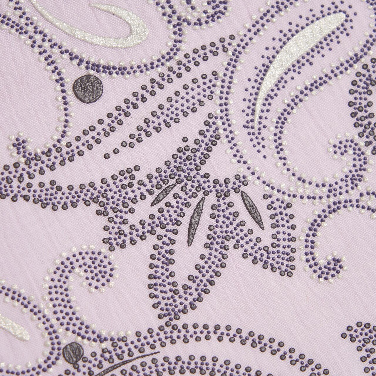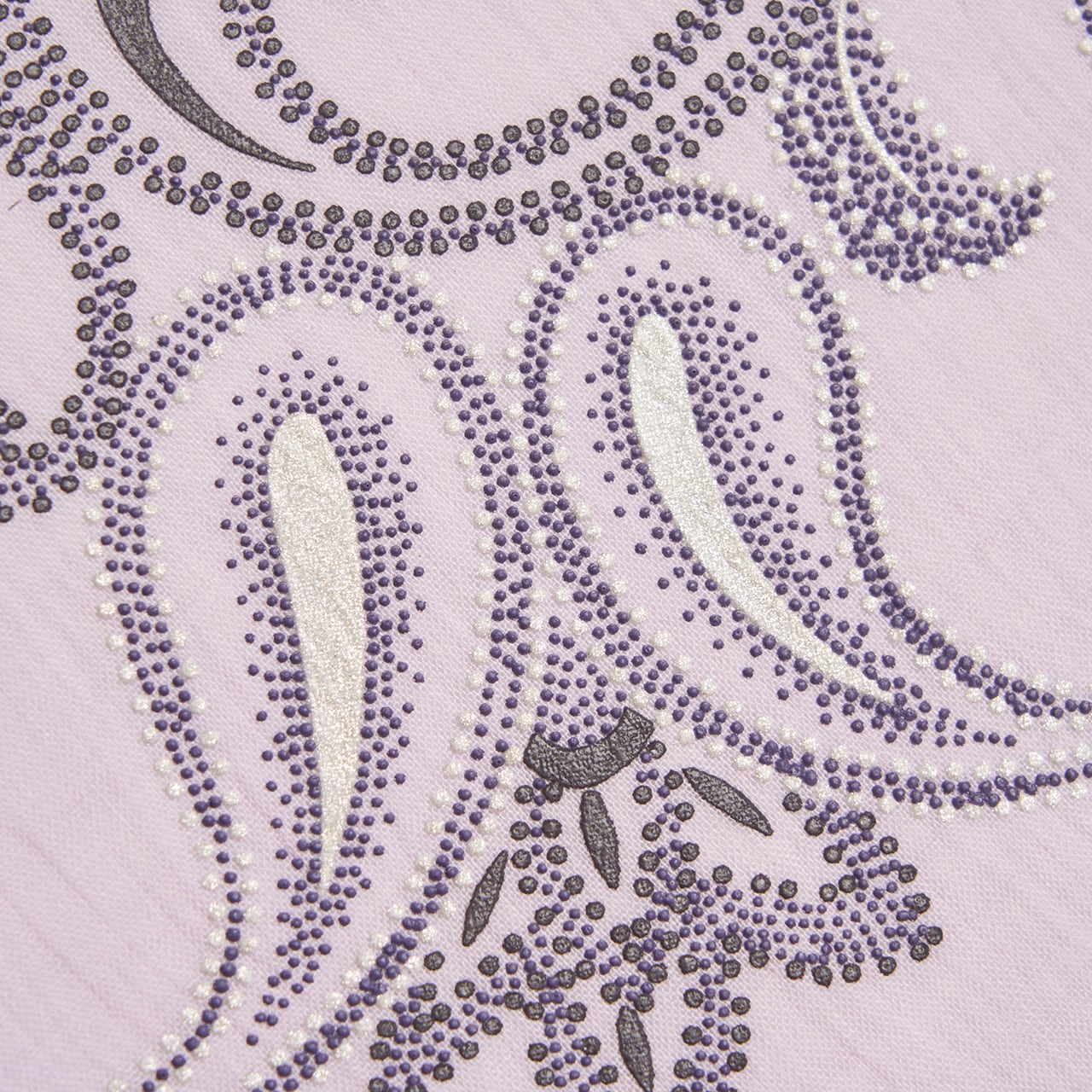 細やかな点描画のように表された模様には独特の雰囲気があって、ペイズリーの中の模様なども暈しのようになっていて、とてもお洒落で銀の箔とのバランスも良く、地色の淡い薄紫と印傳の濃い紫とのコントラストも、とても綺麗ですっきりとした素敵な帯となっています。