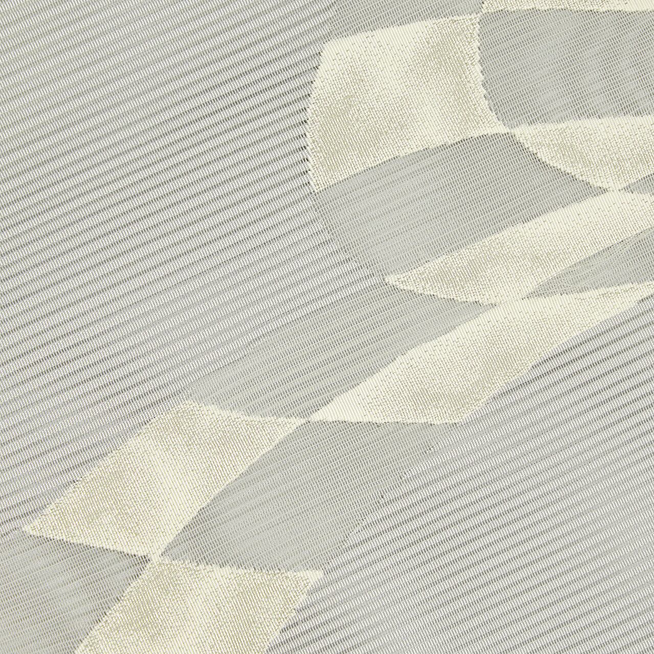 少しだけ青緑色味のある明るいグレー・湊鼠色の絽綴れの地に、お太鼓には翻る布のような形が取られ、乳白色の白と銀色の糸で四角の形が綴れ織の技法で織られたものと、紗のような透け感のある織りとなったものとで市松の配置に織り出された、とてもすっきりとしたお洒落な夏の八寸名古屋帯です。