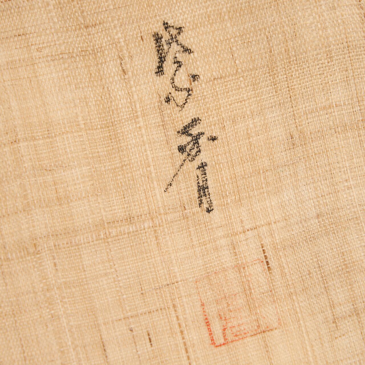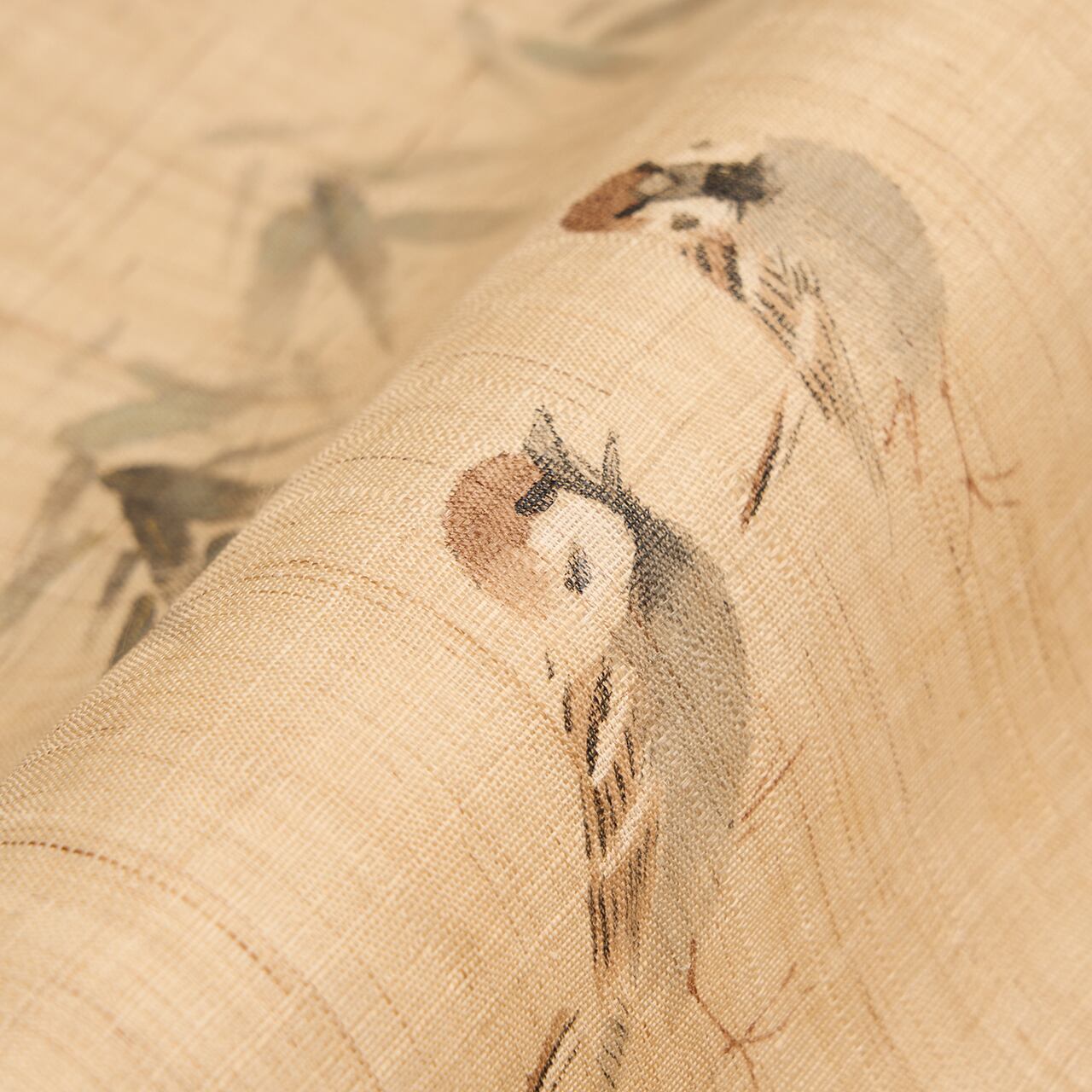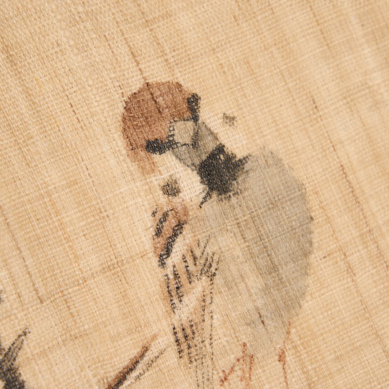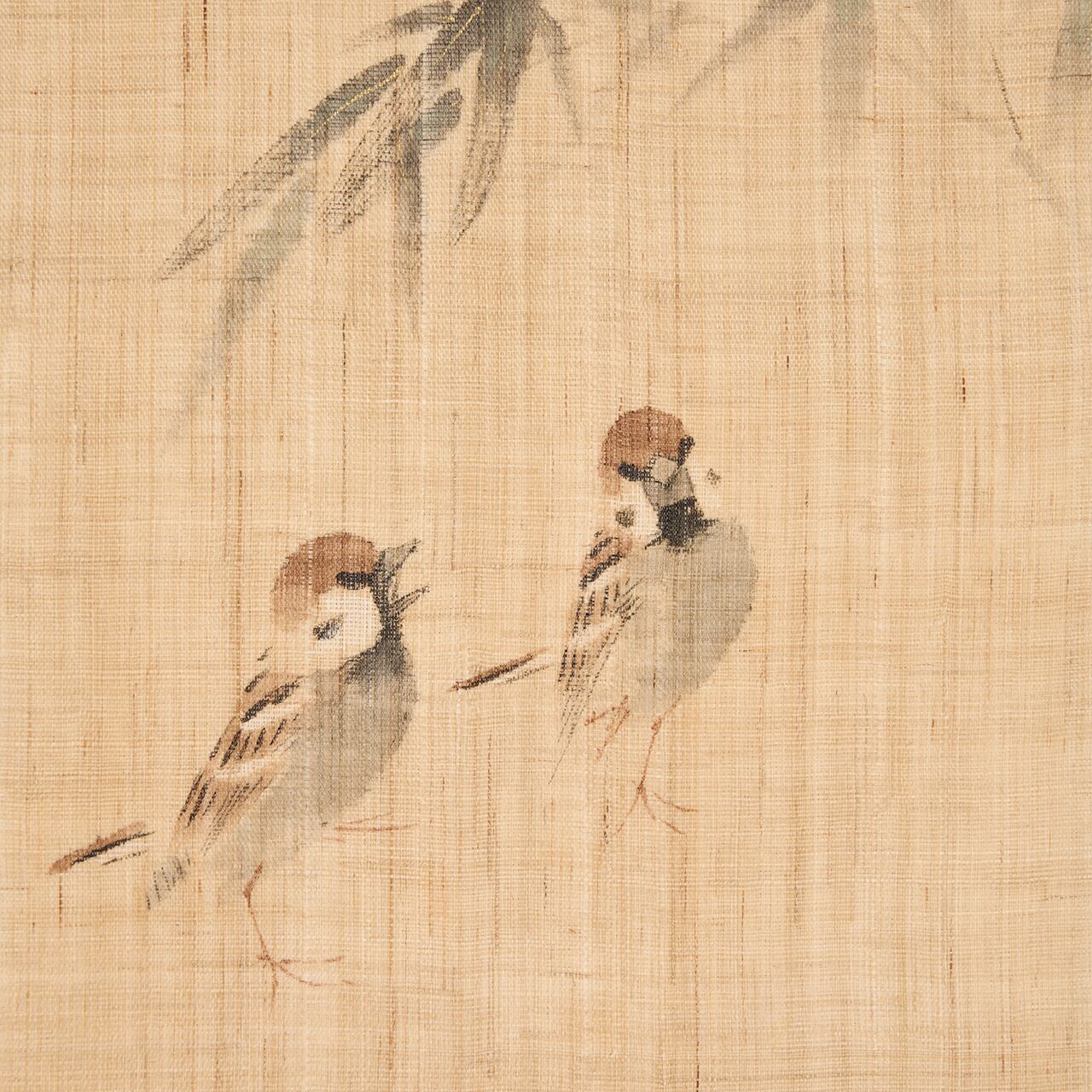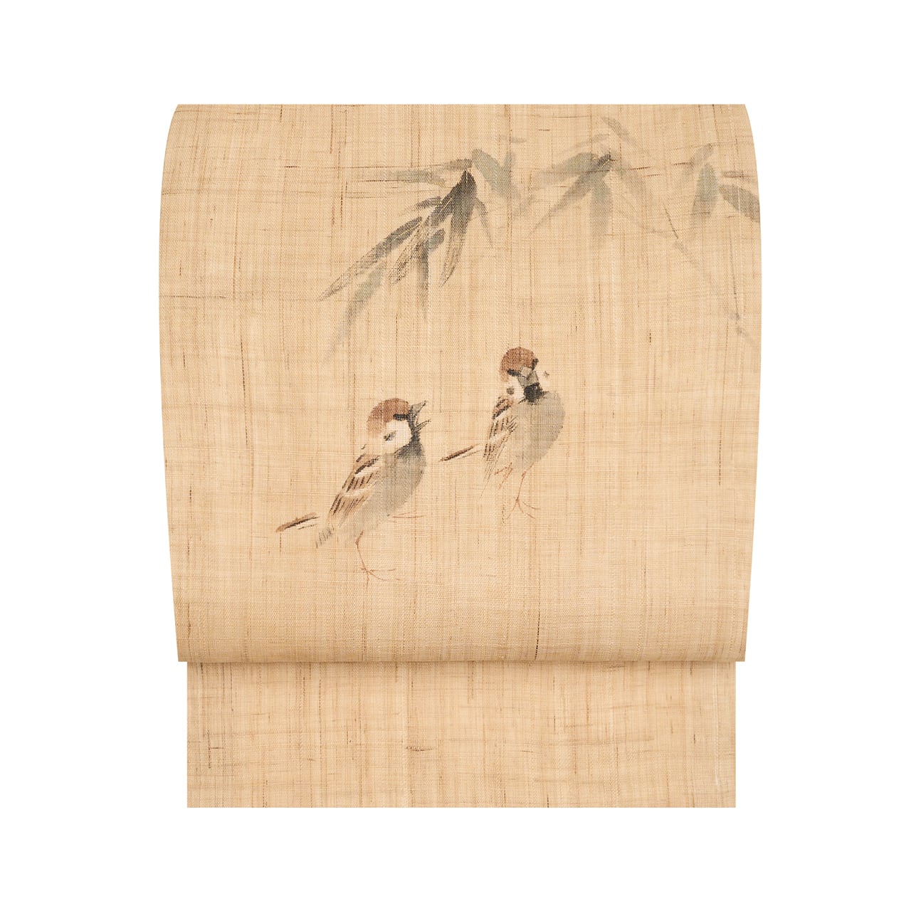 経緯に少し濃い色の糸が混ざったきびらの麻の自然の色に味わいのある生地に、お太鼓には墨書きで笹の葉が描かれ、その木陰のようなところに2羽のスズメがお話をしているように佇んでいる、素朴で懐かしいような模様が染められた、素敵な夏の九寸名古屋帯です。