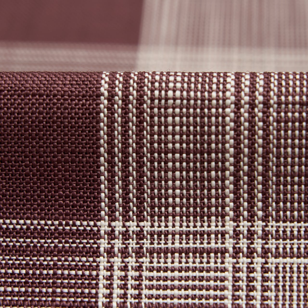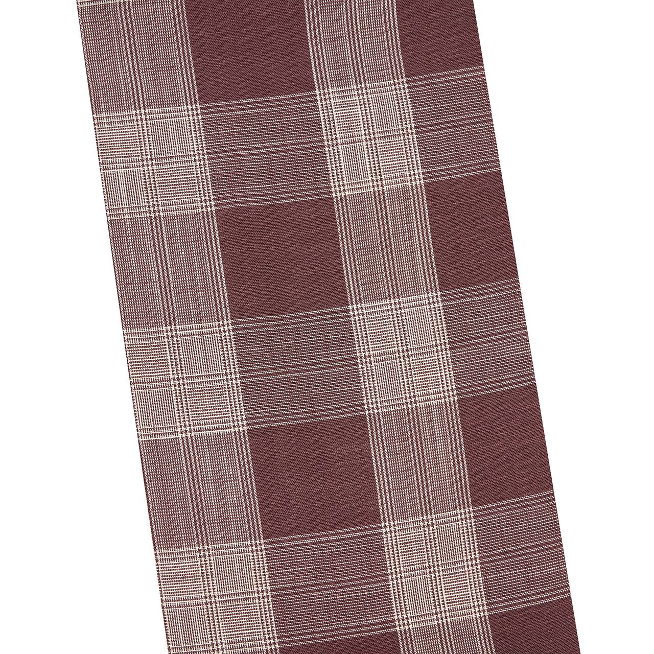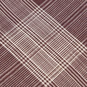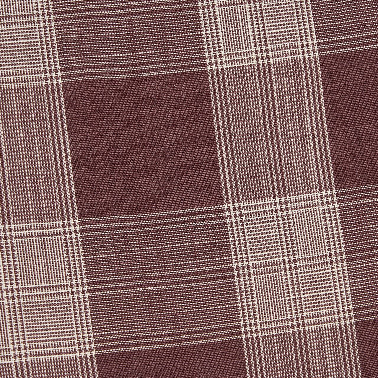 少し赤味のある臙脂色系の濃い紫色の麻の地に、生成り色の糸で細く太く縞が経緯に全通で織り込まれて格子の模様を構成している、とてもすっきりとしたお洒落な夏の八寸名古屋帯です。