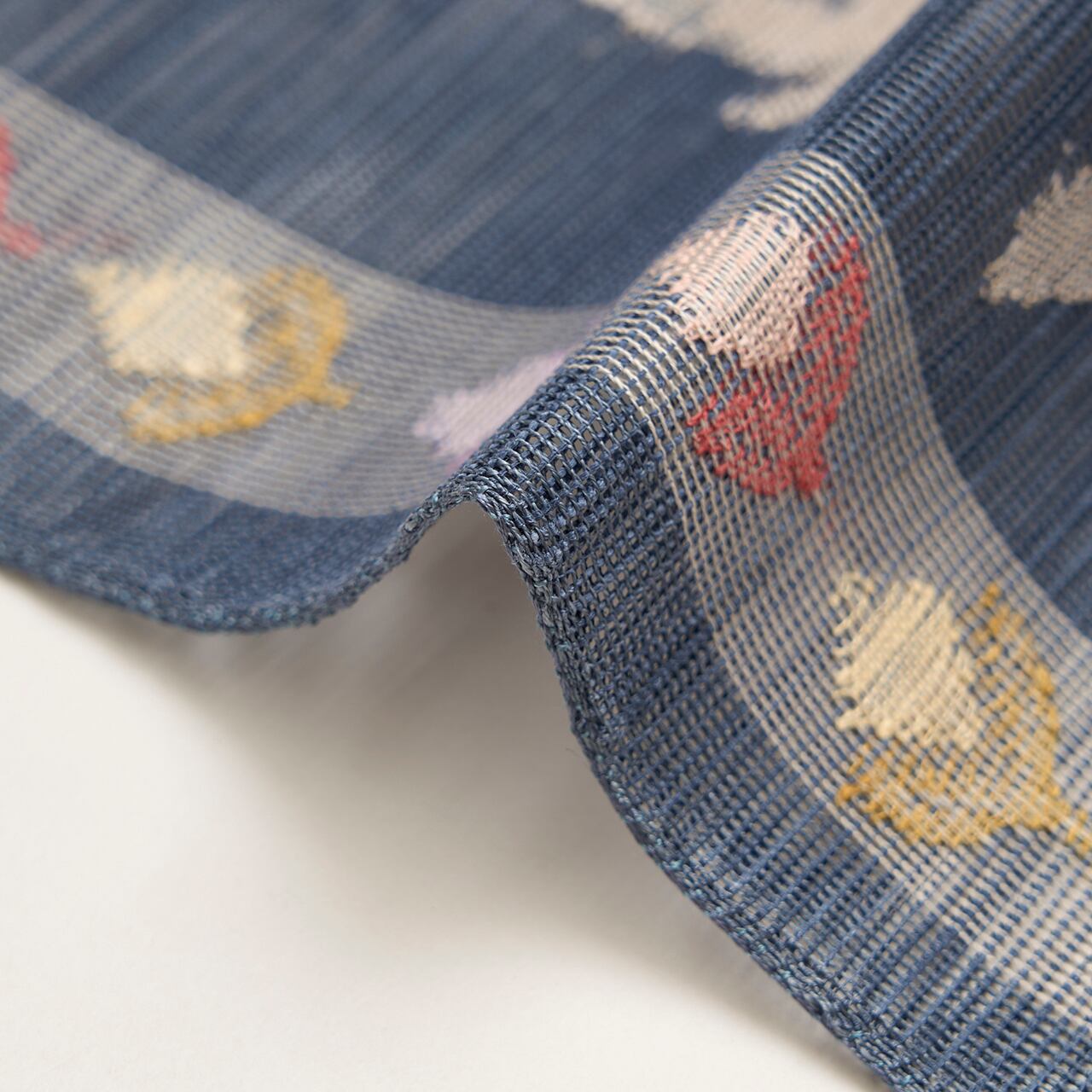 ウェブのお写真ですと、地の紺色の部分などが少し白くモヤモヤとしていますが、透け感のある織りによるもので、実物はそのようには見えません。