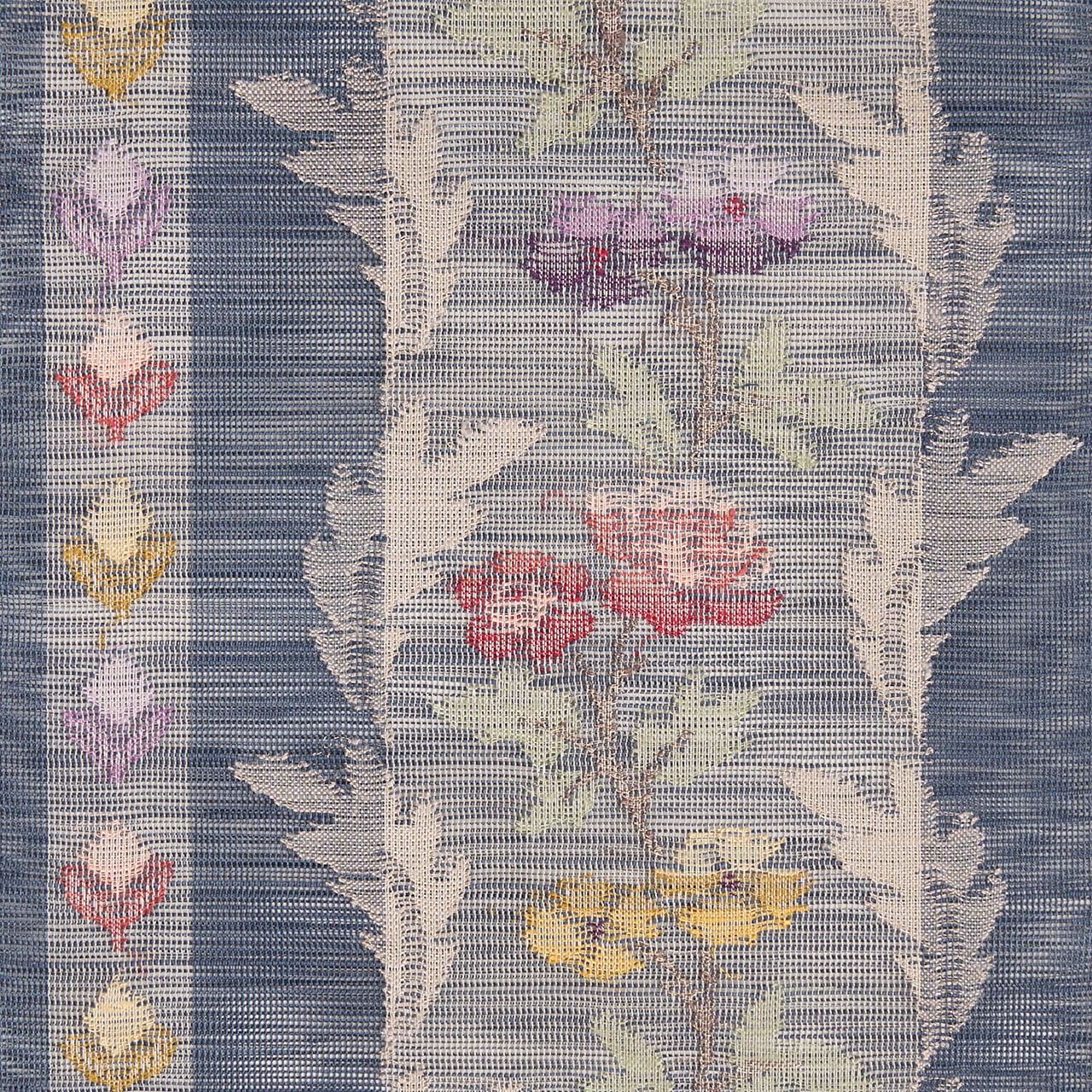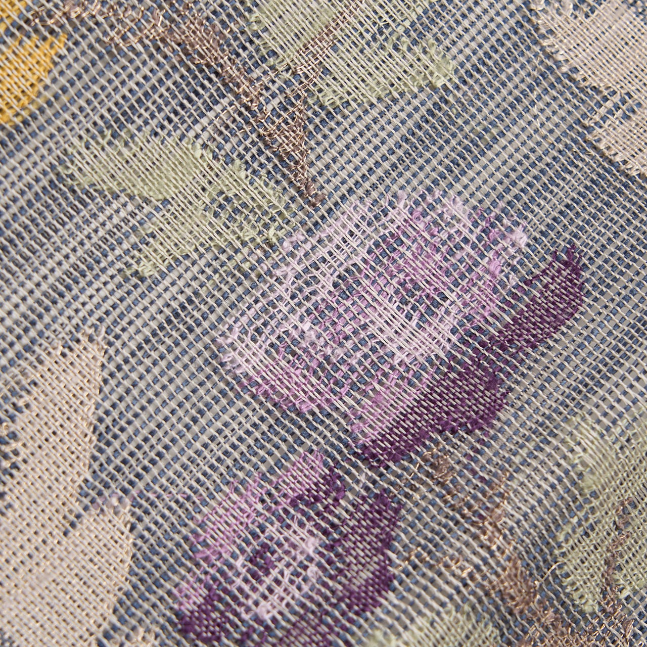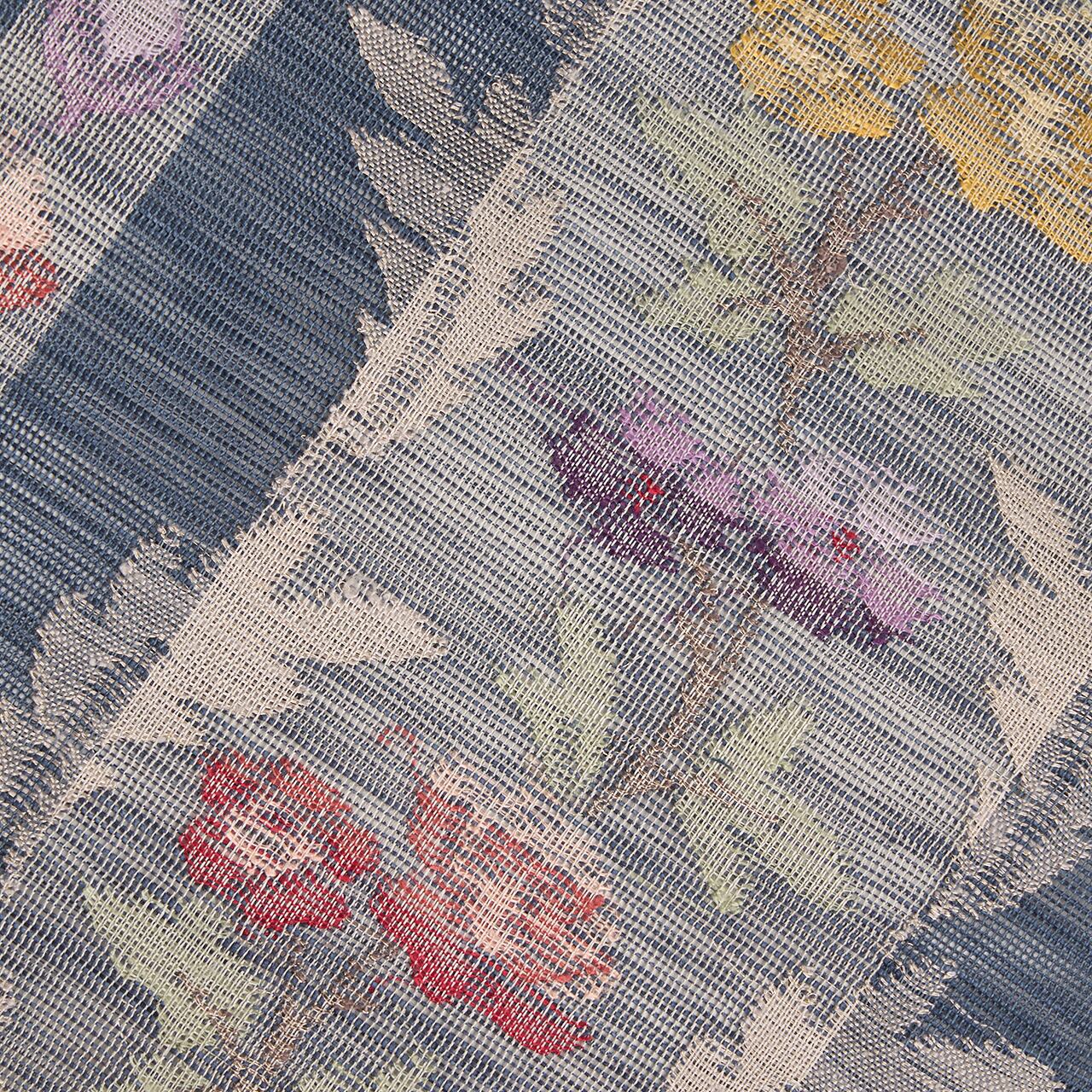 レースのように織られた草花の様子がとても綺麗で、薔薇やナデシコのお花は真紅の赤や葡萄色の紫、淡黄色などの糸で暈されたように表現されています。