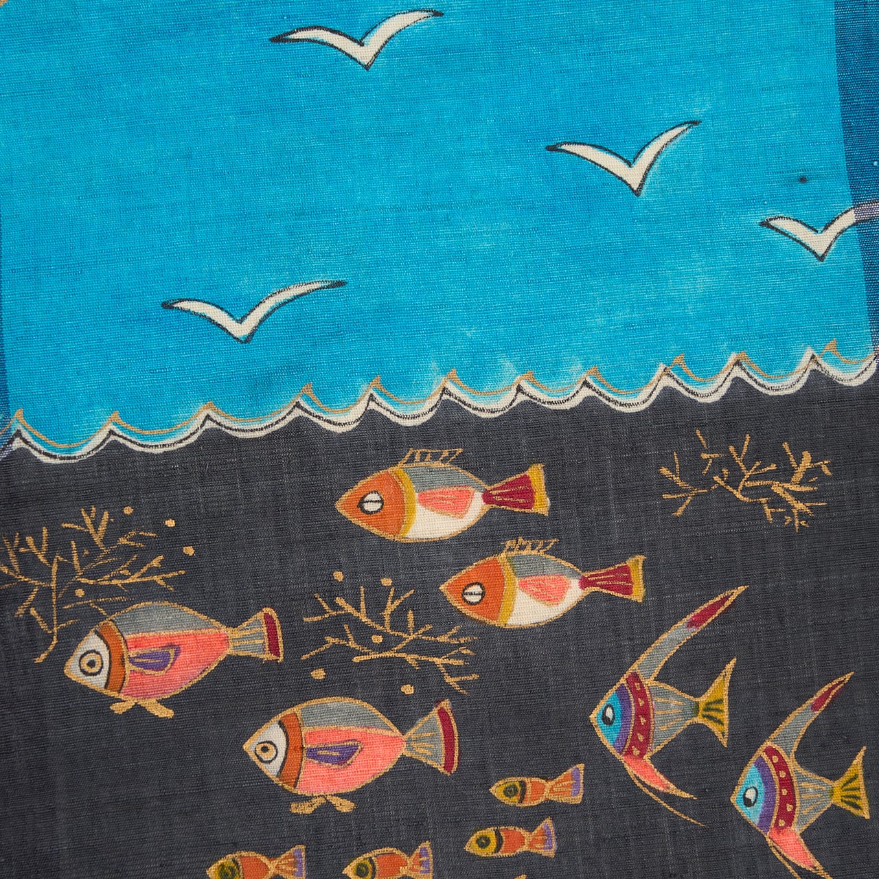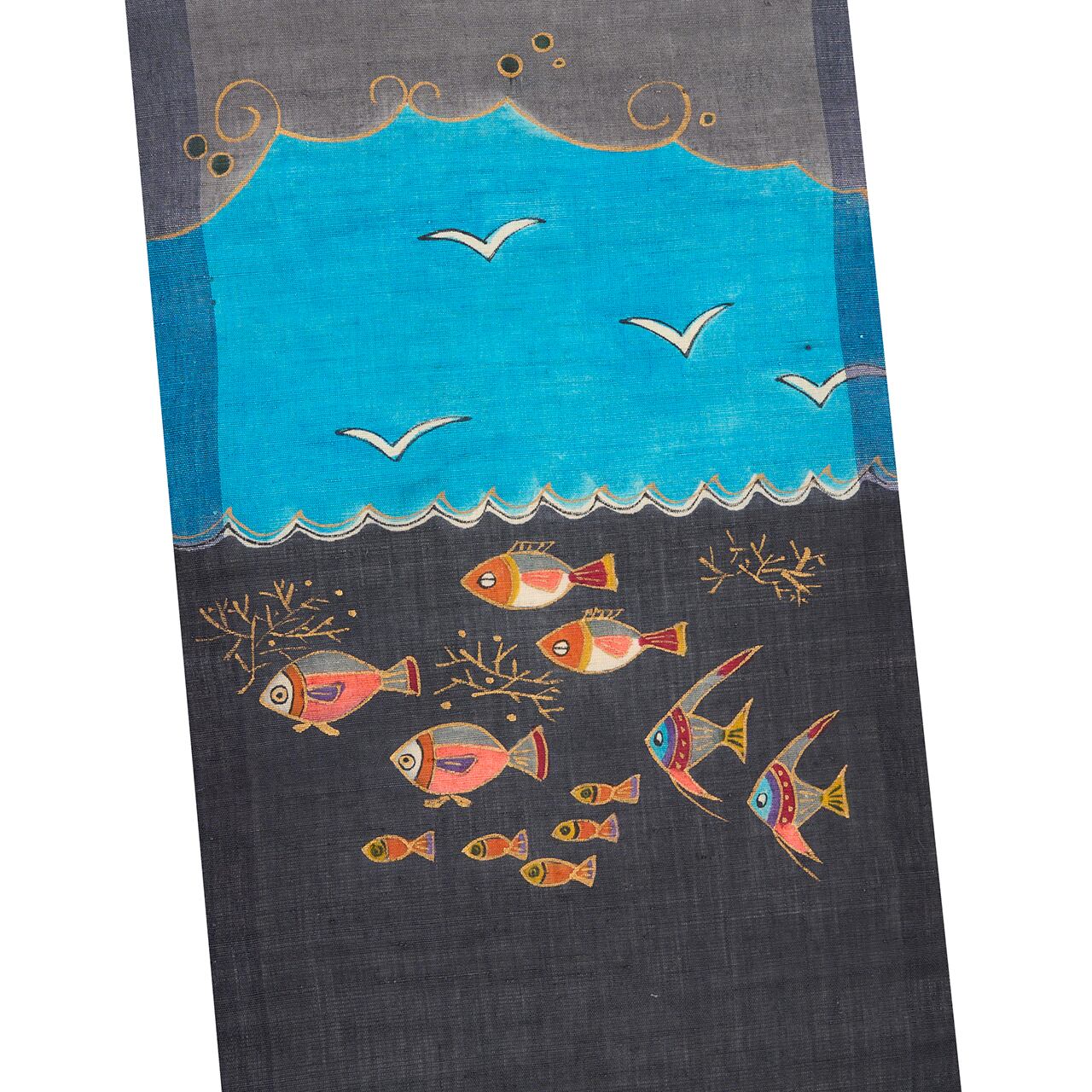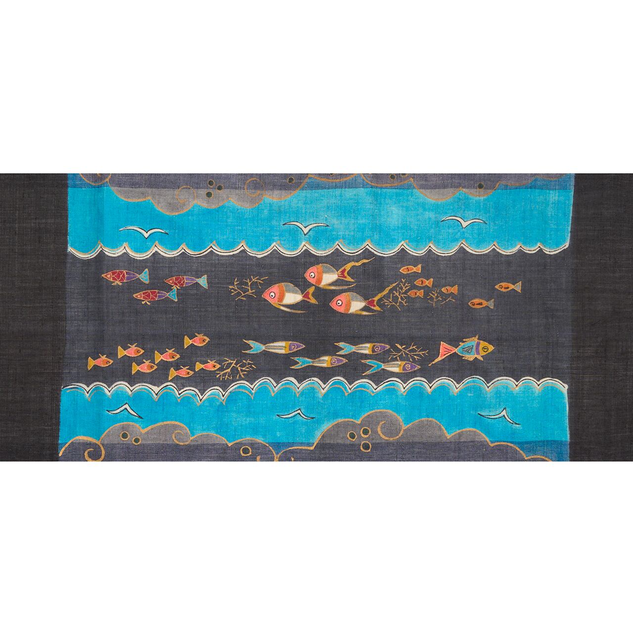 こちらは比較的打ち込みのしっかりとした麻の生地が、全体的に黒に染められて、お太鼓は一番上は中くらいの濃さのグレーに染められ、次は空の青が染められて白いカモメが飛び交い、その下は地色の黒で、色とりどりのお魚がたくさん泳ぐ様子が描かれています。