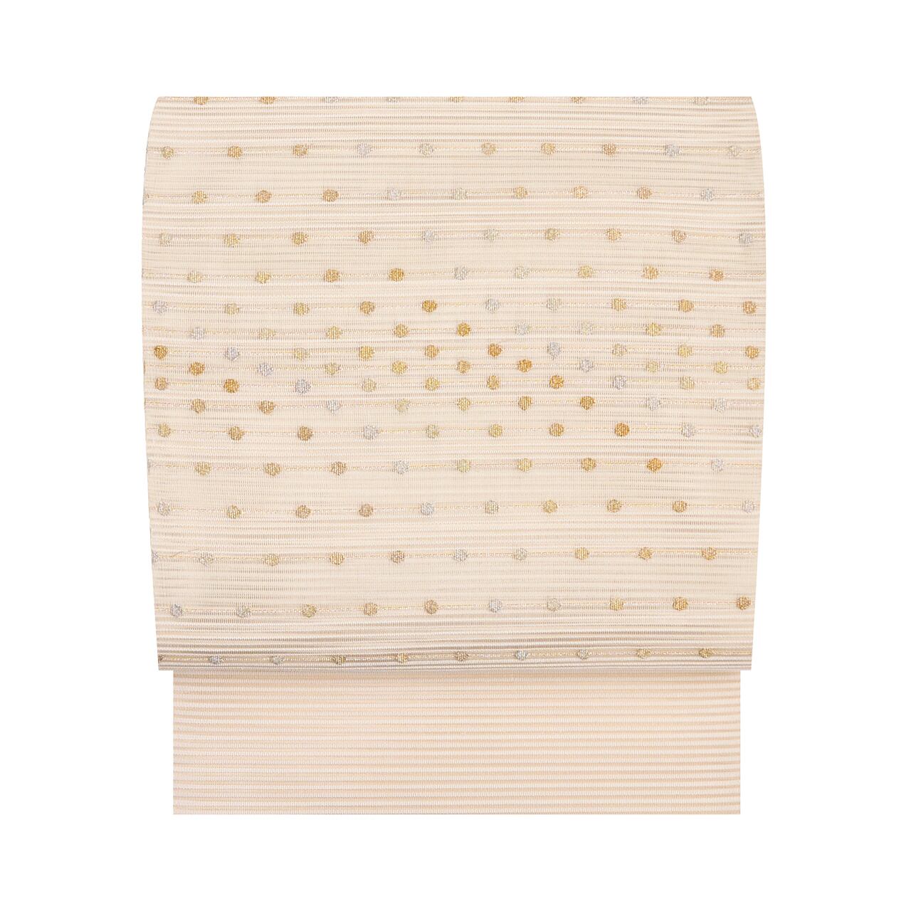 象牙色の手織りのしっかりとした絽綴れの地に、お太鼓は段々に透かし織の紗のような織りになっていて、変化のある金糸と銀糸で斜めに並んだような配置で小さな水玉の模様が織り出された、とてもお洒落で涼しげな夏の八寸名古屋帯です。