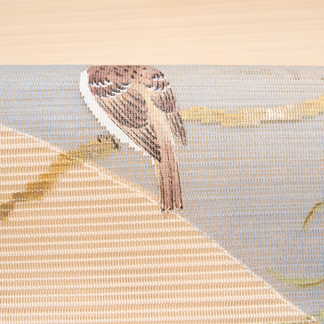 練色のしっかりとした絽綴れの生地に、お太鼓には斜めの線で区切られた遠山の形が取られ、その中が紗のように湊鼠色と地色の練色の暈しに織られ、それを背景に、手前には枝垂れる柳とその幹にとまる雀の姿が見事な手描きで描かれた、素敵な夏の八寸名古屋帯です。