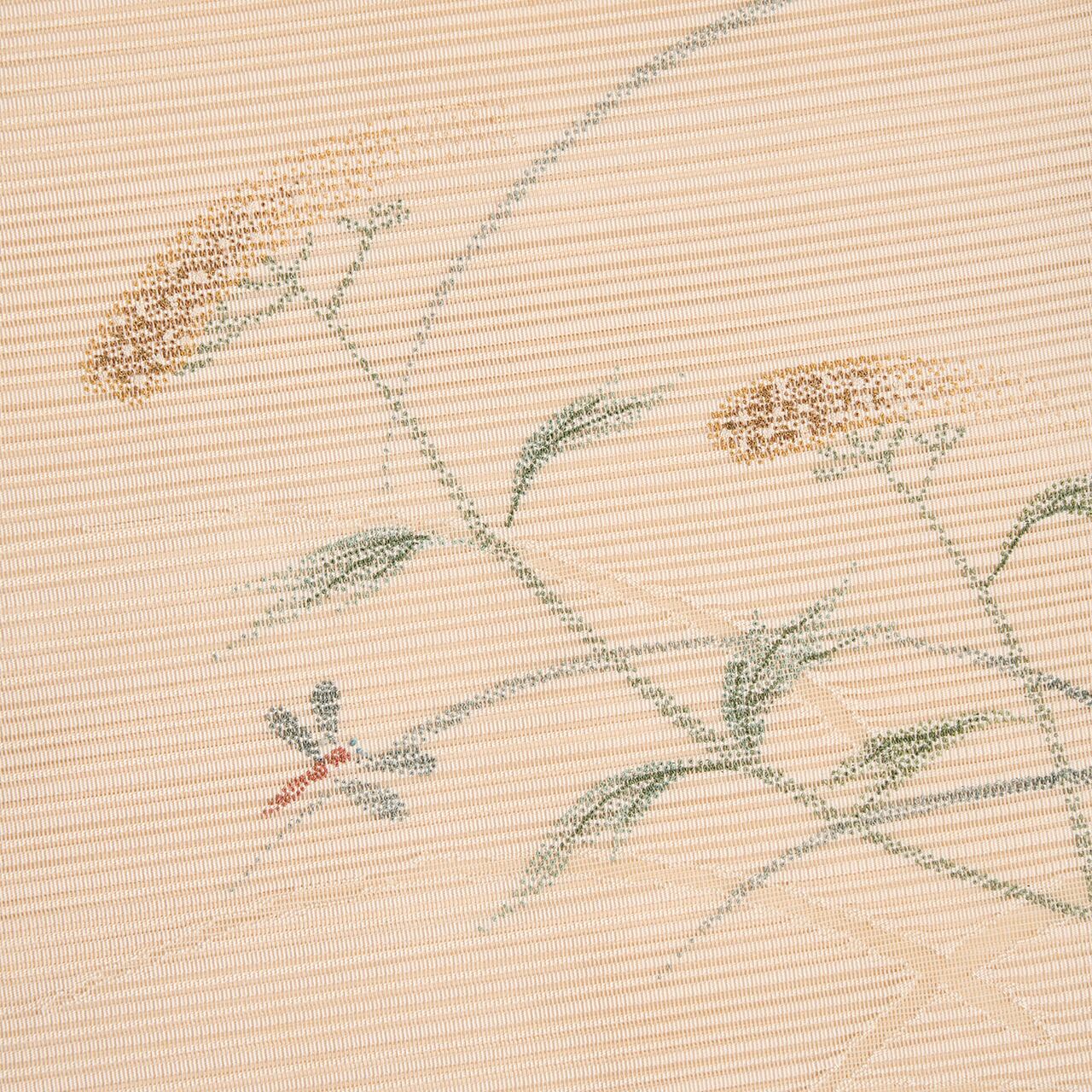 象牙色のしっかりと手織りで織られた上質な絽綴れの生地に、楚々と咲く女郎花とその傍らに飛ぶ小さなトンボの姿が、細やかな相良刺繍で丁寧に描かれた、早めの秋の風情を表現されたような、涼しげな夏の八寸名古屋帯です。