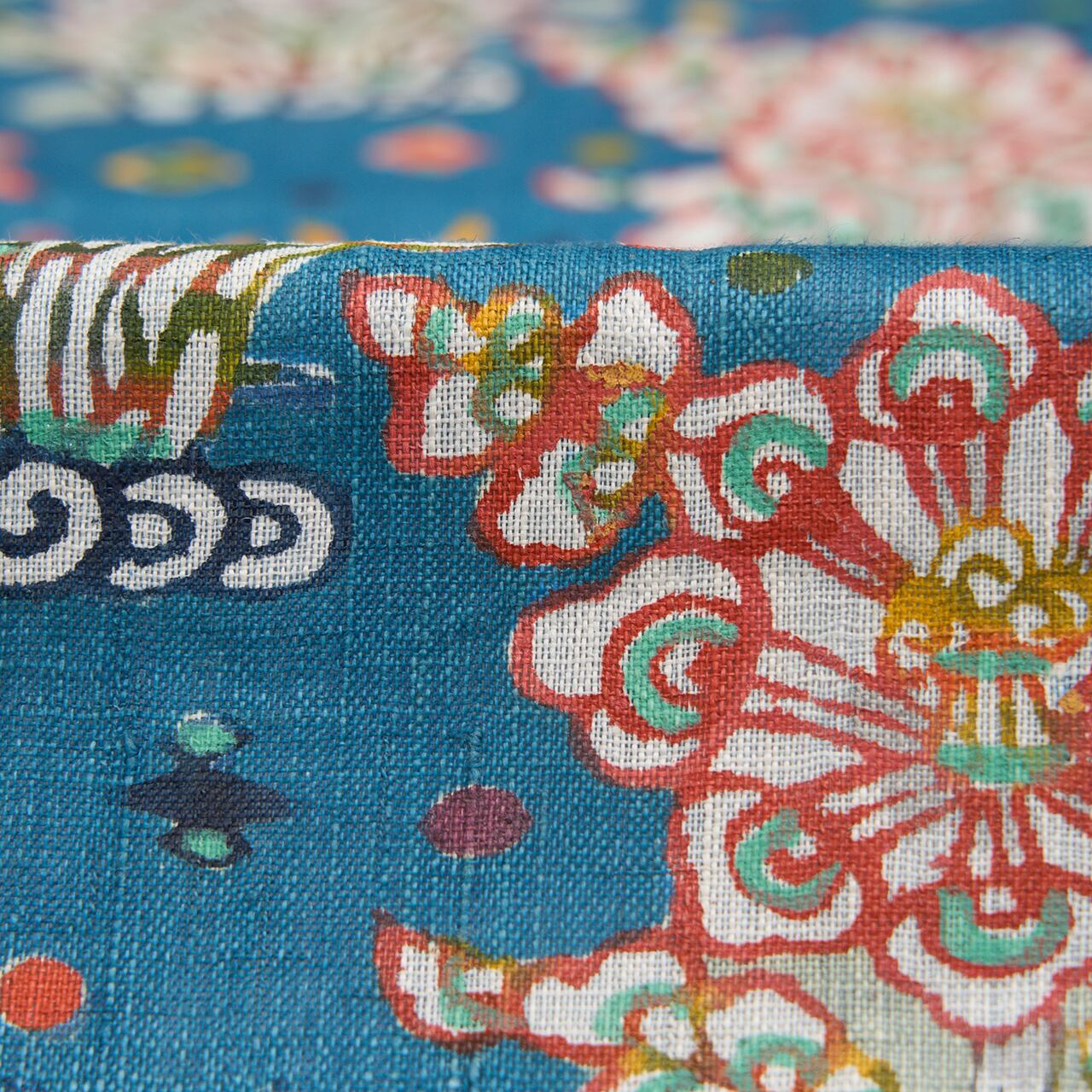 こちらは藍型染ですが、小島さんがこちらの作品のために、新しく型を彫って染めてくださったもので、中型の丸い型に菊に菖蒲、牡丹など四季折々の草花がディフォルメされて多色で描かれています。