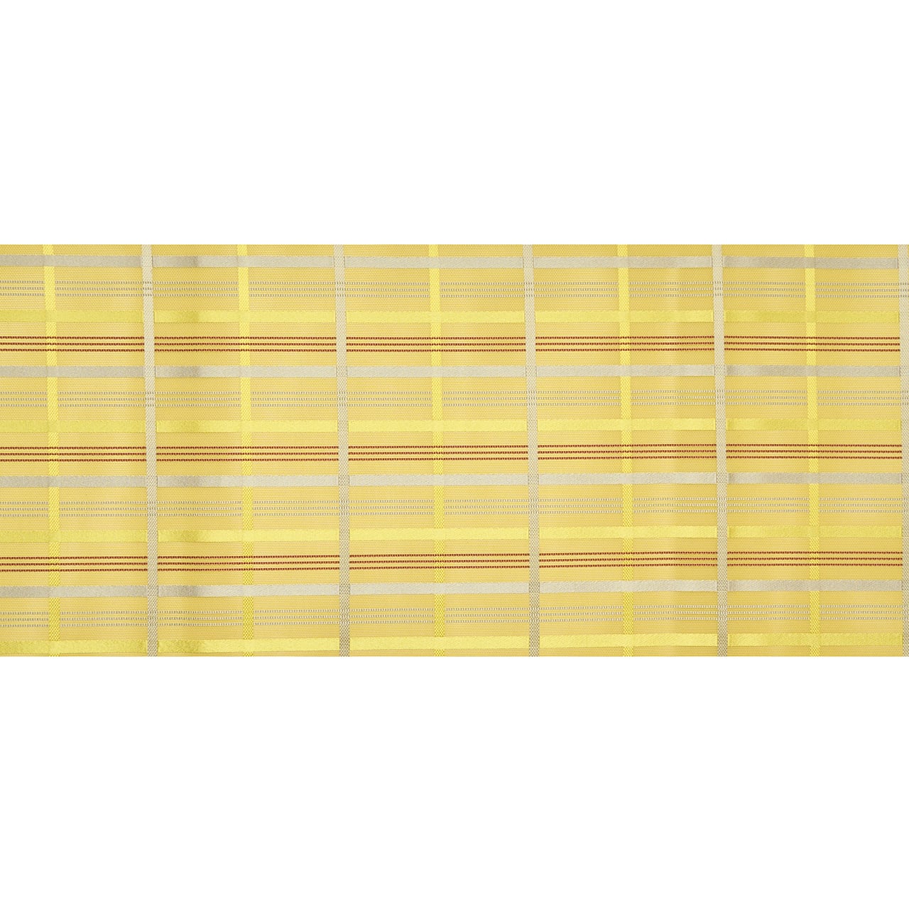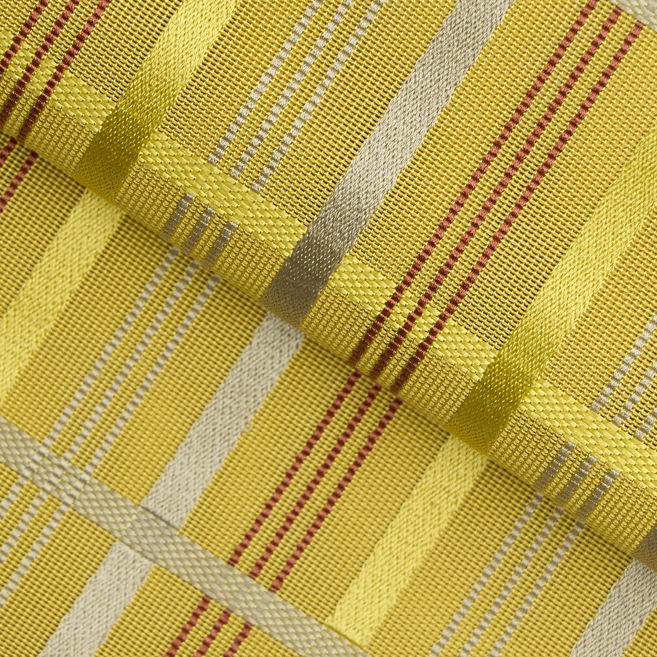 鶸色の糸で平織にされた紗の生地に、利休白茶色と抹茶色の糸で、朱子織のような縞の模様が織り込まれ、その間を縫うように赤銅色と利休白茶色の細い縞が織り込まれ、変り格子のような模様を構成していて、とてもお洒落で涼しげな雰囲気です。