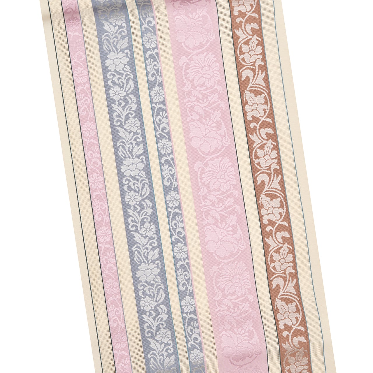 こちらも軽やかで綺麗な色使いと、光沢のある縞の中の唐花模様が程よい華やかさを醸し出していて、カジュアルなアイテムでありながら、しっかりとした品質の良い帯となって完成しています。