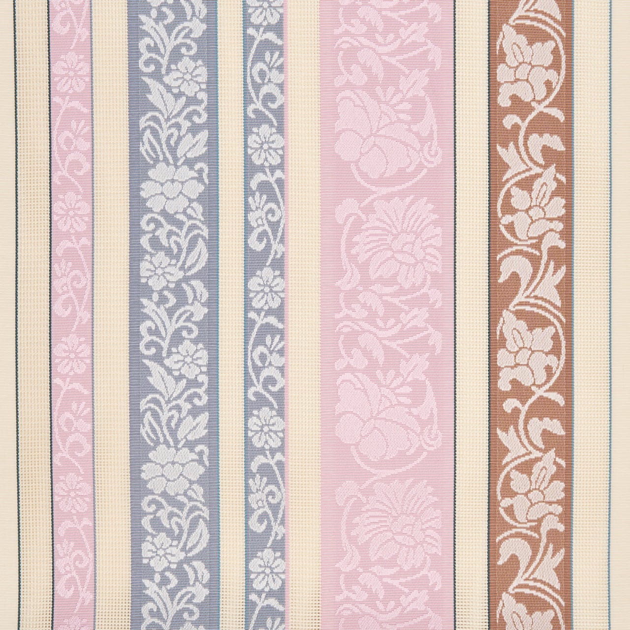 両端はしっかりとした打ち込みの象牙色の生地で、その間は非常に細かいみじん格子のような紗の織りになっていて、それに撫子色のピンクや藍鼠色、焦香色などの縞が太く細く織られた中に、いろいろな種類の花唐草模様が織り出された、すっきりとした雰囲気がお洒落な博多織の夏の八寸名古屋帯です。