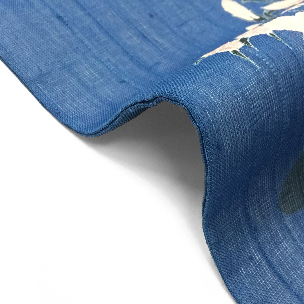 深い青・紺鼠色に染められた、経緯に少し節が見られる紬紗の心地よい透け感が感じられる、シャリっとした生地のお太鼓に、群生する桔梗のお花が描かれた夏の九寸名古屋帯です。