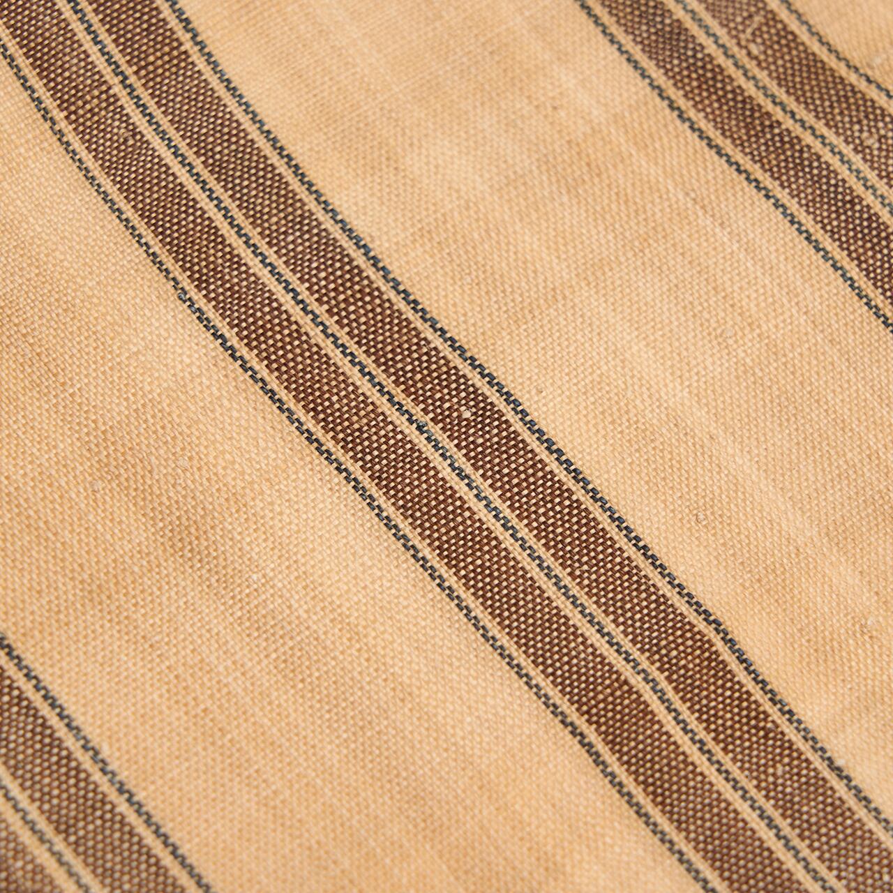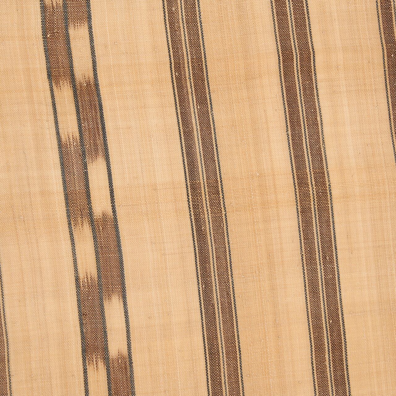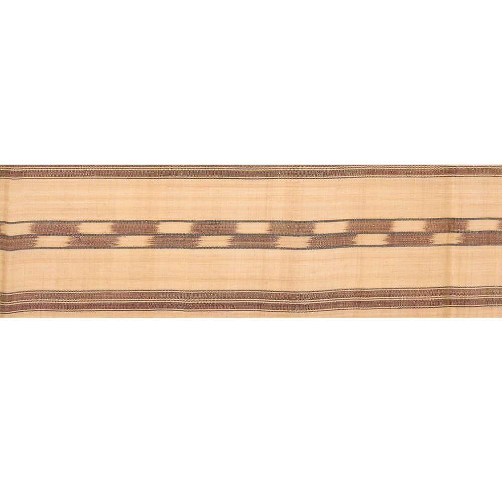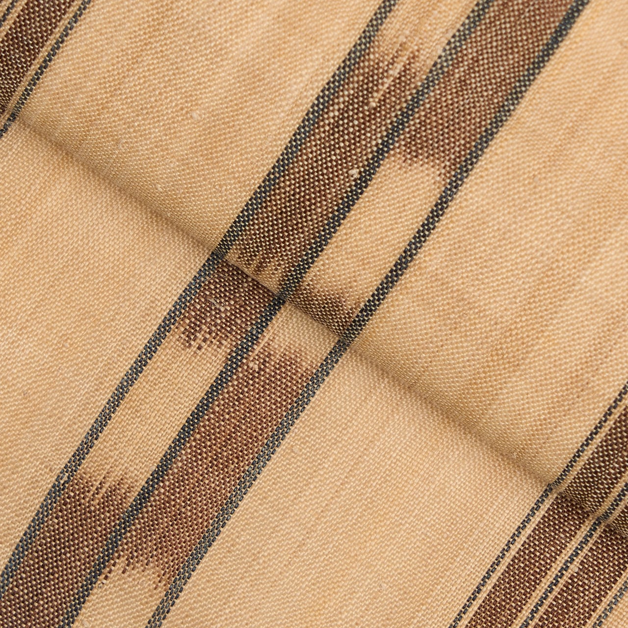 こちらは、こっくりとした明るい薄茶の芭蕉布らしい透明感のある地に、車輪梅で染められた糸で太い縞が4本織られ、左から2番目には縞の中にトーニーといわれる家畜の餌箱を表した絣(トーニー綾仲)の模様が2列並んで、ヒキサギーの絣のように織り出された、お洒落な雰囲気の九寸名古屋帯です。