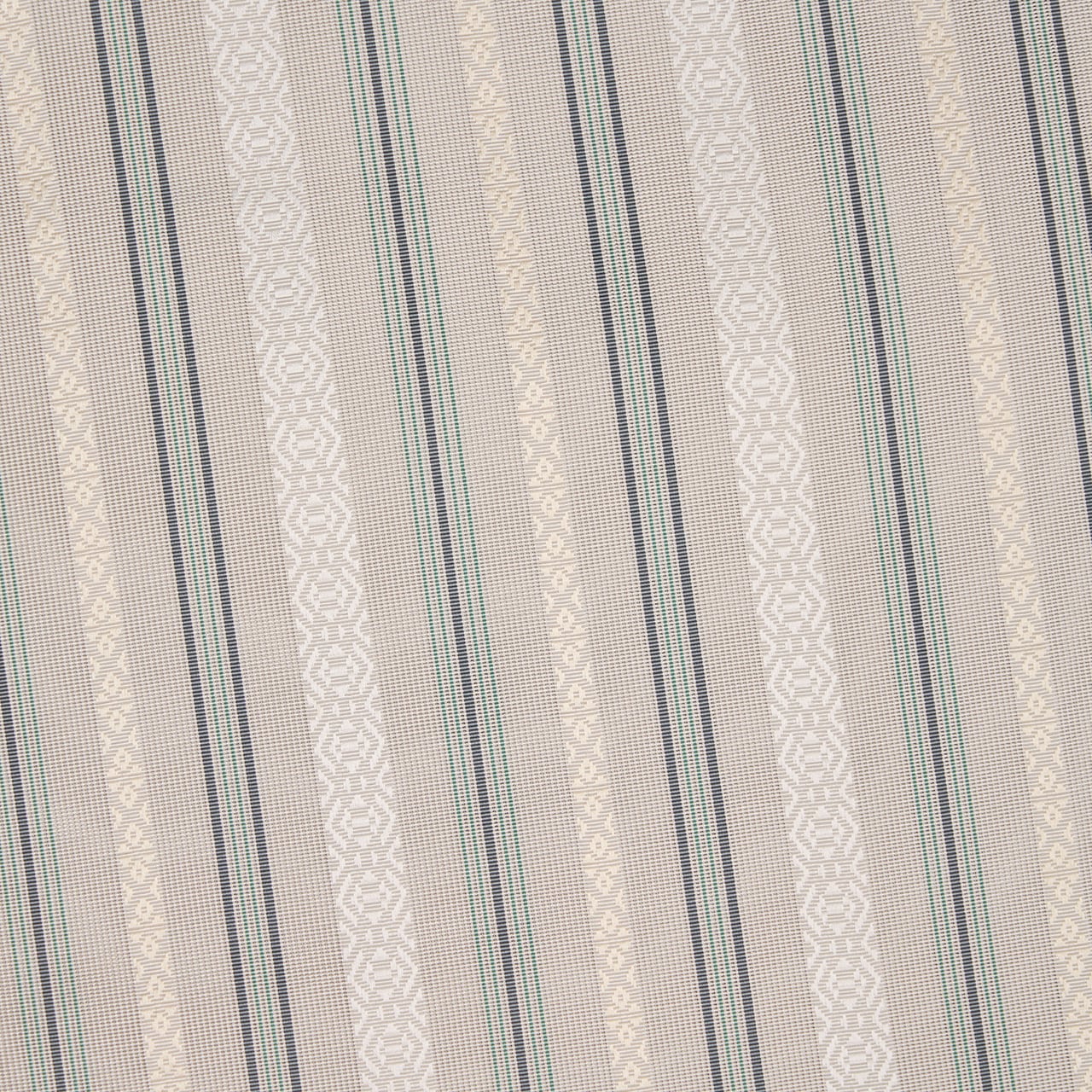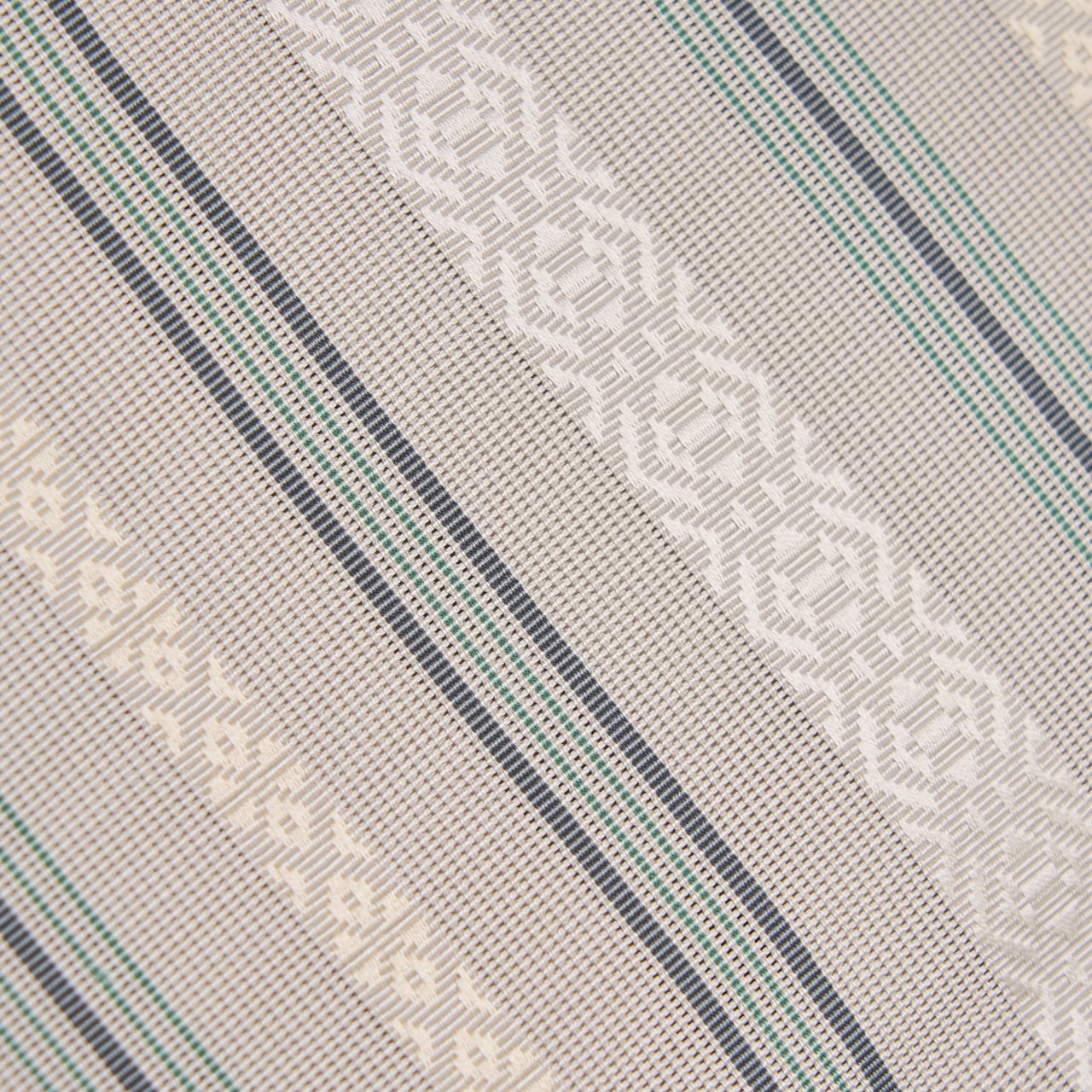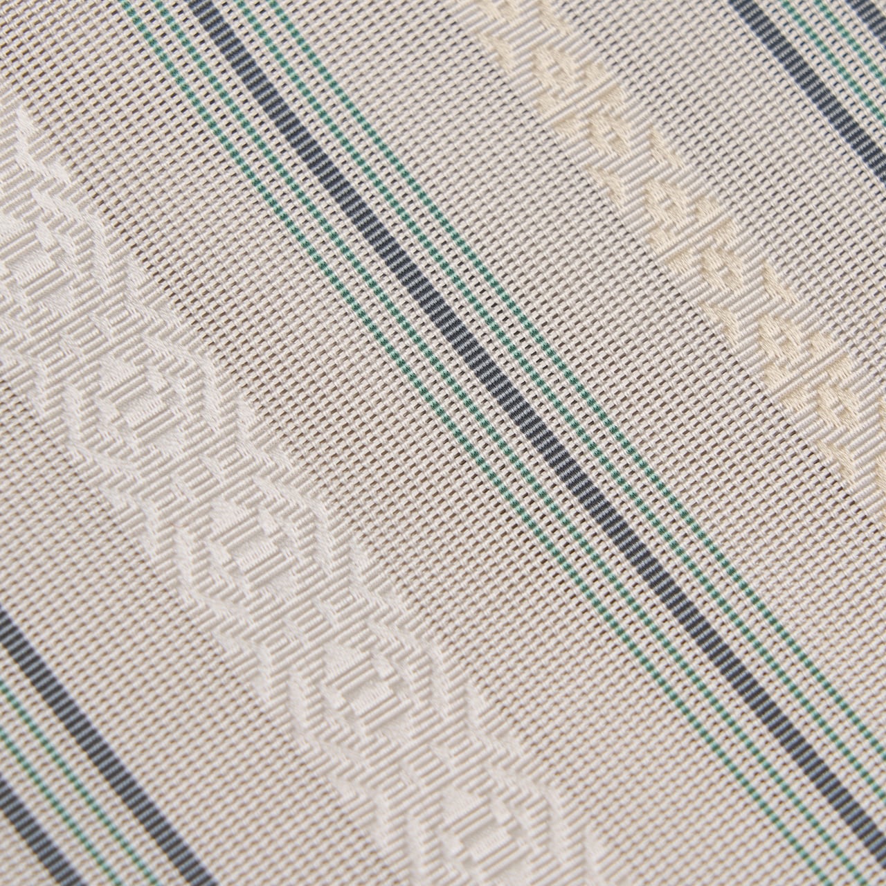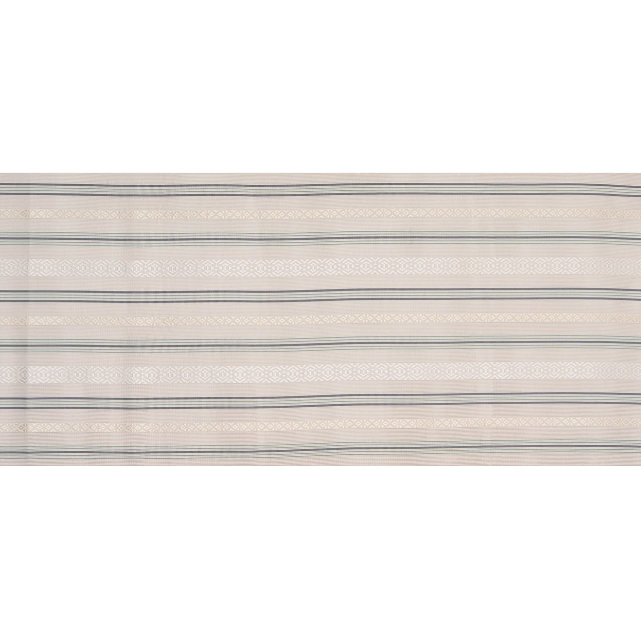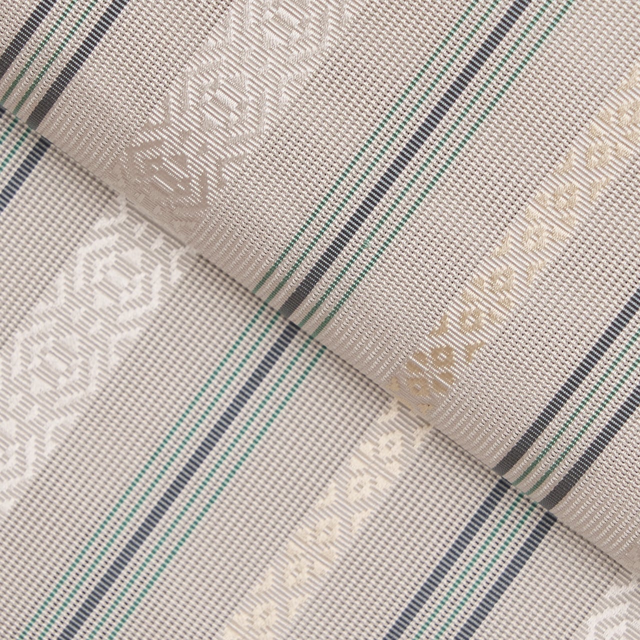 とても淡いグレー・灰黄緑色のしっかりとした紗の地に、褐色と萌葱色の縞が6カ所入れられ、その間に白練色の糸で独鈷と花皿が織り込まれた、伝統的な献上の模様が表された本場筑前博多織の夏の八寸名古屋帯です。