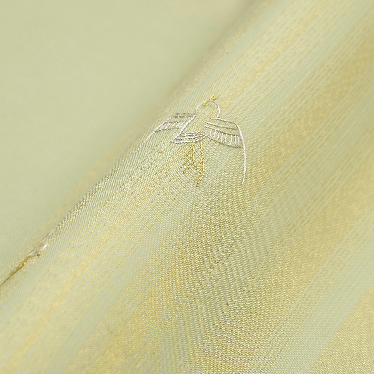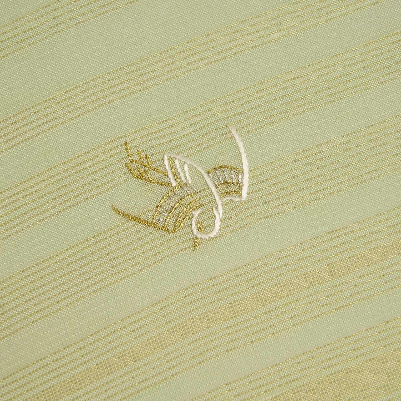 サラッとした薄手の裏葉柳色の淡い草色の紗の生地に、お太鼓には干潟の浅瀬の浜に漂う水の光を表すように、キラキラとした非常に細い金駒の糸で霞のような横段が織り出され、そこに飛び交う可愛らしい千鳥の姿が細やかな手刺繍で表された、気品と清涼感の溢れる素敵な夏の九寸名古屋帯です。