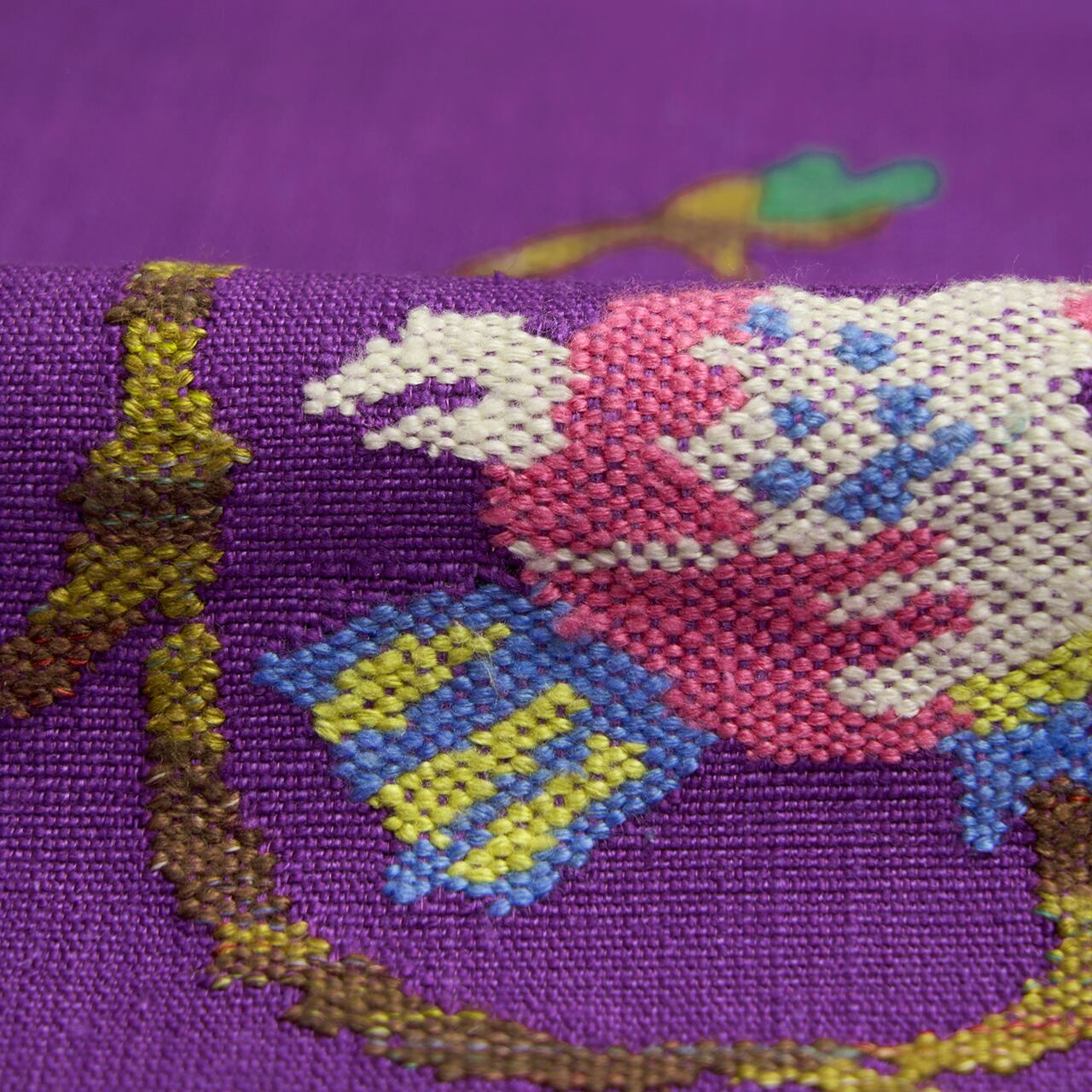 模様のモチーフとしては、正倉院文様的な唐花の蔓草に鳥の模様ですが、きちんとした手機でいろいろな色の糸を使ってカラフルに可愛く織り出されていて、刺繍のように見える質感もとてもほっこりとするような、なんともいえないチャーミングさがあり、彩りもとてもきれいです。