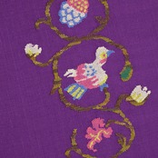 モダンさの感じられるとても綺麗な紫・桑の実色のあまり厚手ではないしなやかな紬地に、お太鼓には唐花のついた蔓草がくるりと織り出され、その真ん中に可愛らしい小鳥がとまる様子が、刺繍のように見える立体的な織りで、いろいろな色の糸で表された、とてもお洒落な八寸名古屋帯です。