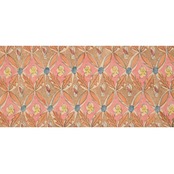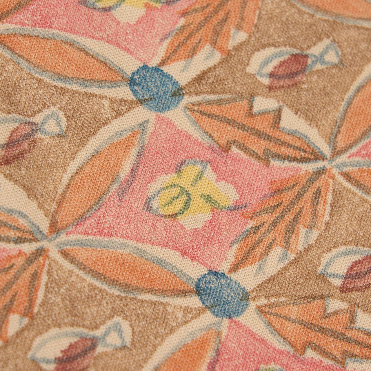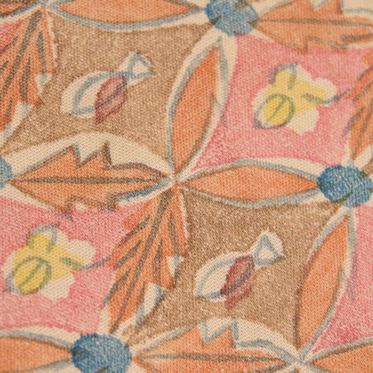 経緯とも双糸の木綿の糸でななこ織にされた、シルクのようなタッチの生地が柴染色の薄茶で染められ、中型の大きさの七宝繋ぎの模様が蘇芳香色で描かれて、中心には黄色の小さなお花が添えられたり、小さなお魚の姿も見えたり、また七宝のつなぎ目には舛花色の丸が置かれた、優しい色使いの更紗模様の素敵な九寸名古屋帯です。