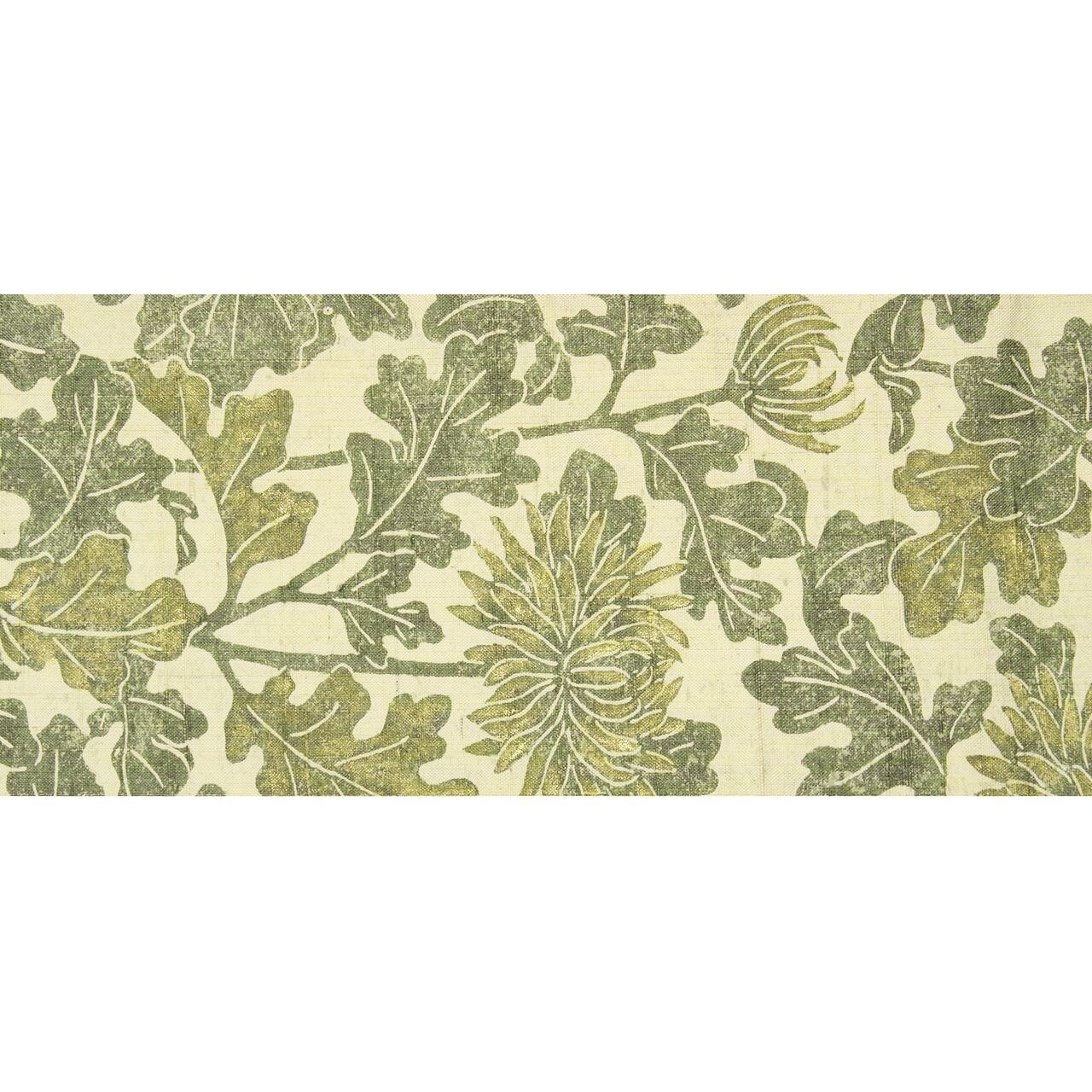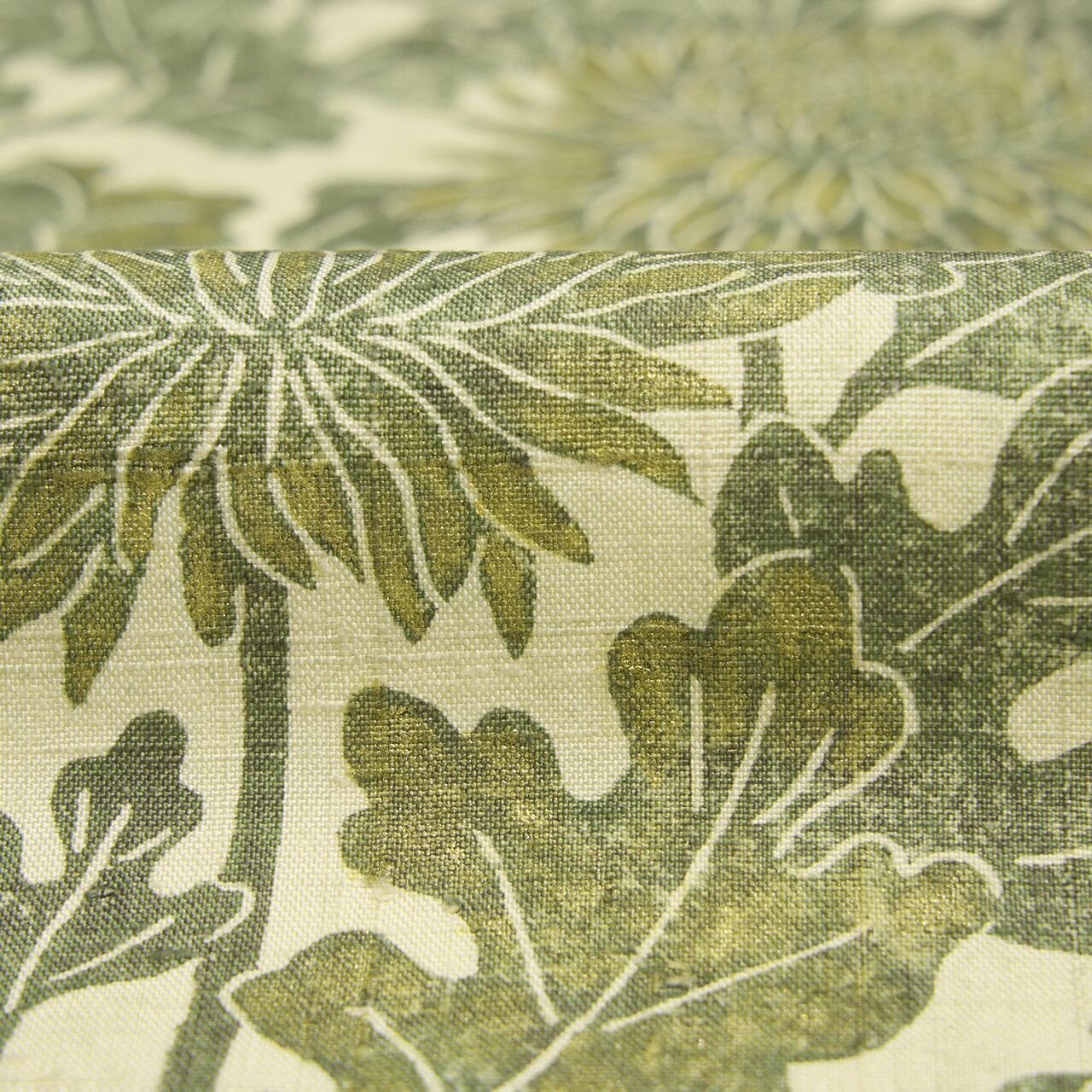 経緯に少し節のあるサラッとした質感の象牙色の紬地に、たっぷりとしたボリュームで咲いている菊のお花が、型染めで色止めをしたところに蝋散らしのような技法の蝋纈染めで、老竹色の渋めの薄緑と根岸色っぽい金彩で染められた、とても雰囲気の良いお洒落な九寸名古屋帯です。