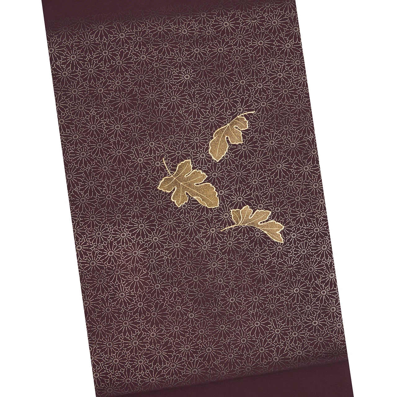 端正に並んで染められた菊のお花の銀彩と、実物の葉を置いたような臨場感で染められた金彩の立体感とのコントラストが非常に美しく、見とれてしまうような技の美が感じられます。