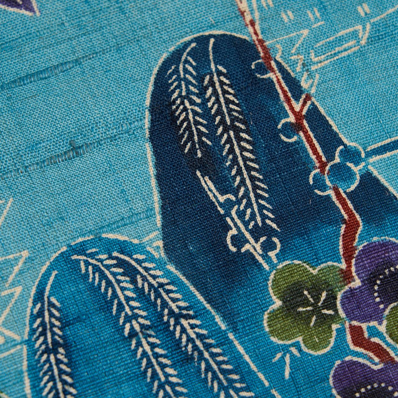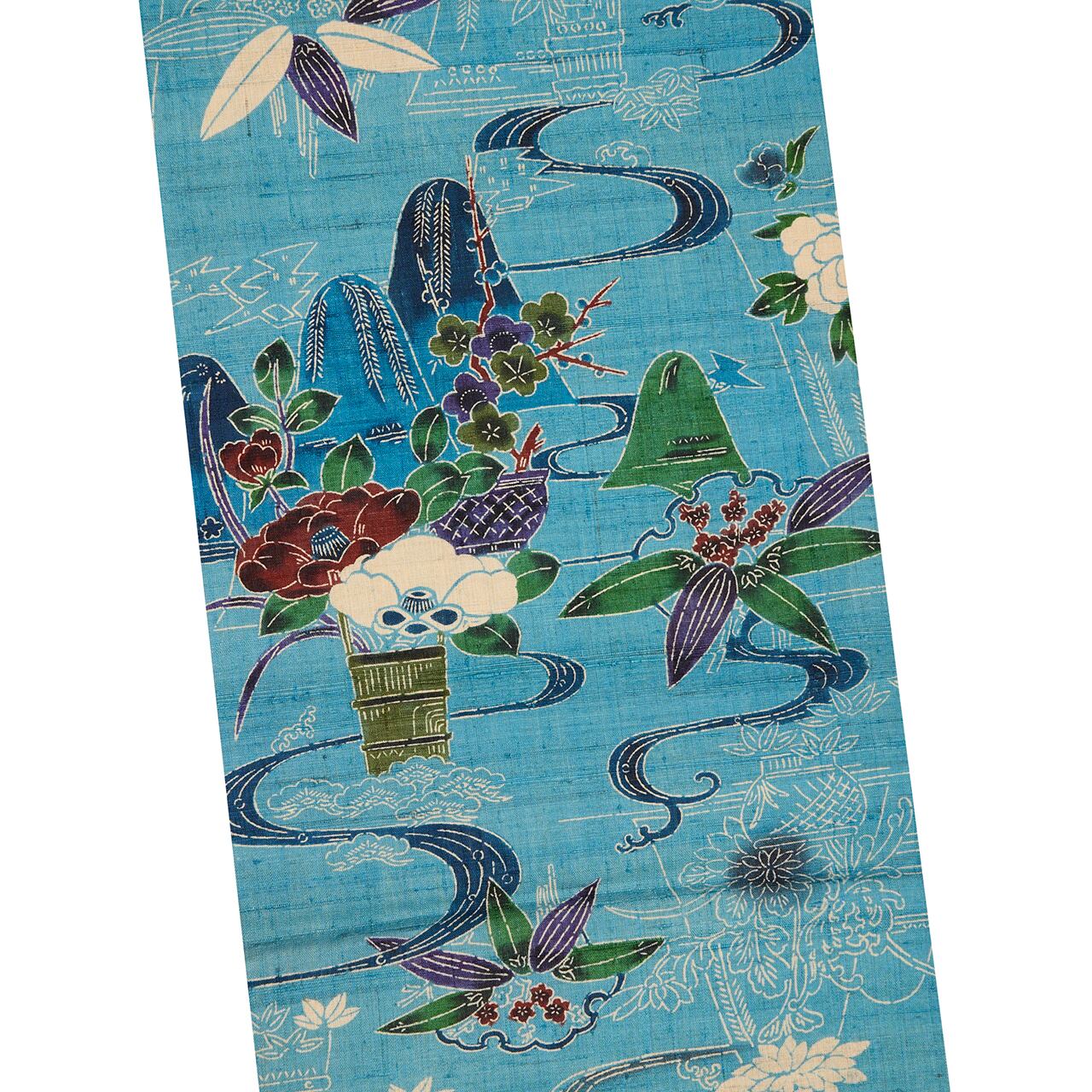 緯糸に節のある座繰りの生紬のさらっとした生地が、明るい藍・花浅葱色に染められ、遠くに山々が並び、水が流れ、松や笹が茂り、近くには竹筒や竹かごに椿や梅、菊のお花などが生けられた模様が、型染で白く染め抜かれています。