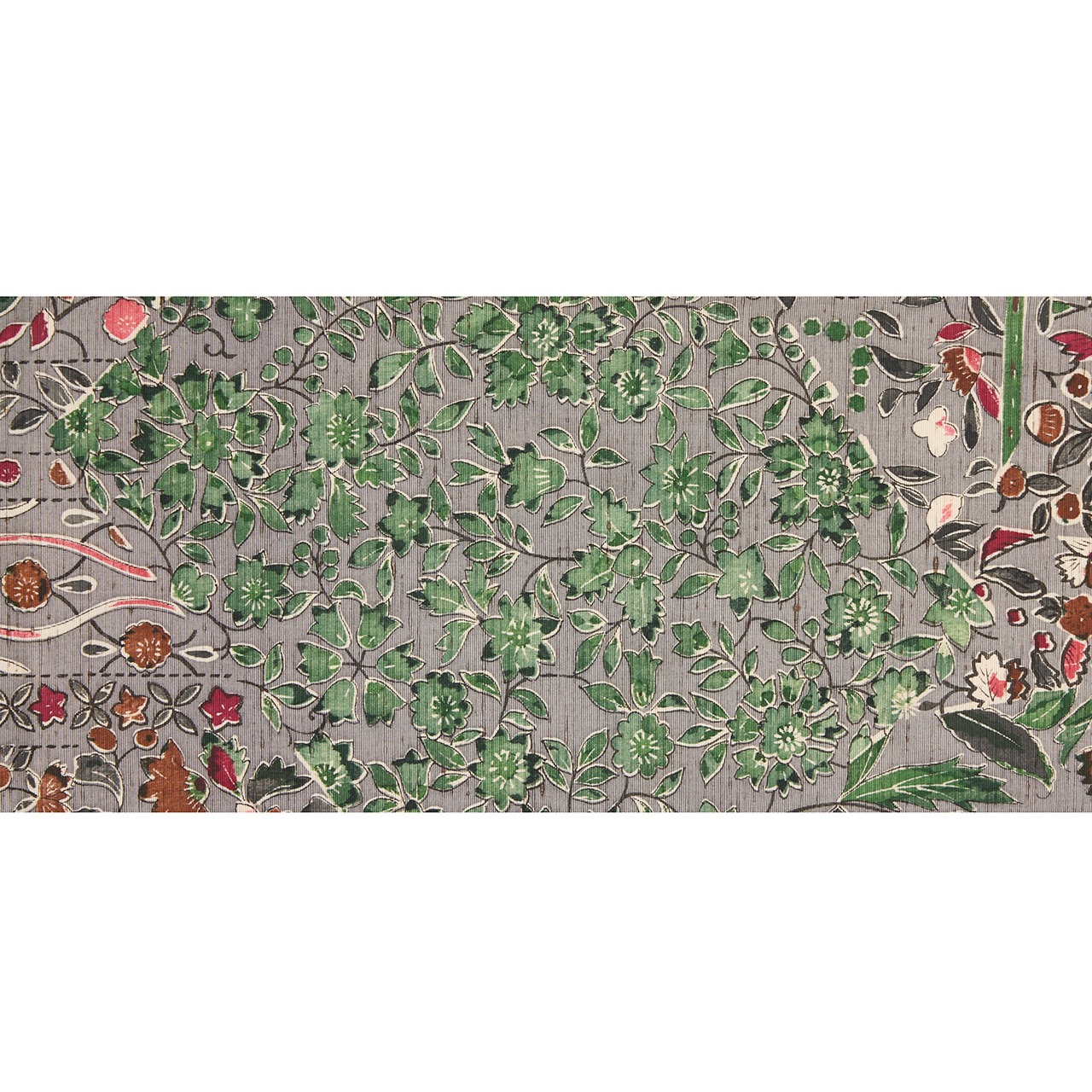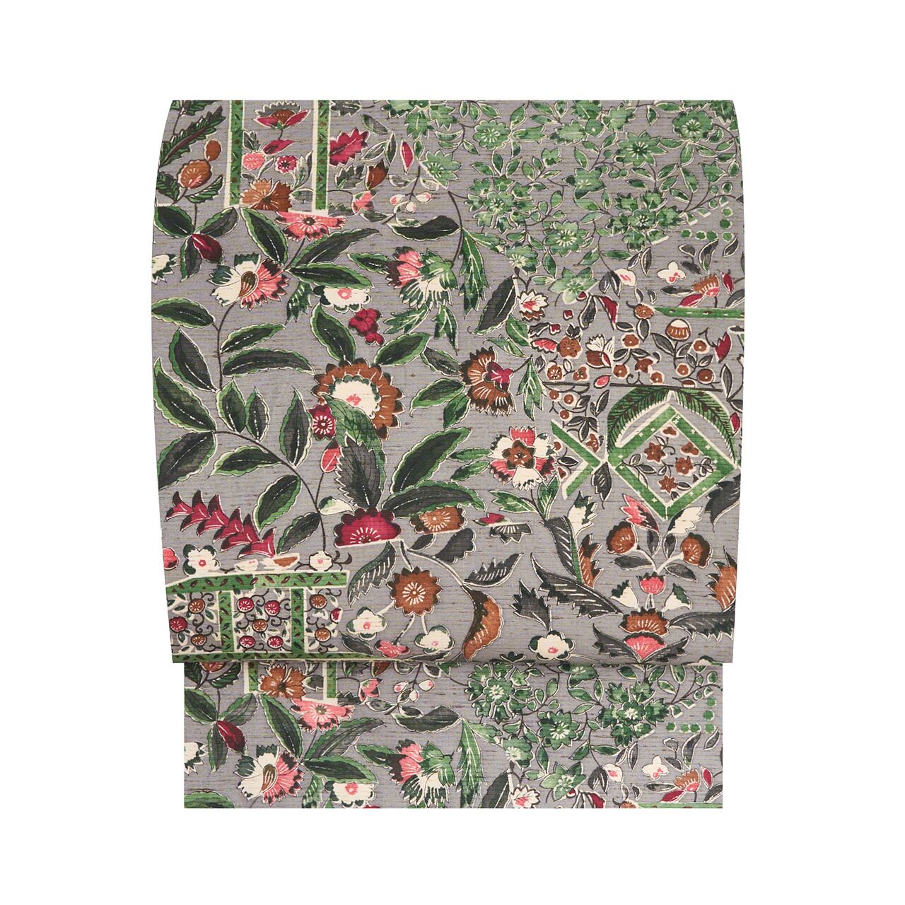 緯糸にネップのような節がある少しフワッとした手触りの、緑味のあるグレー・豆がら茶色の紬地に、裂取で区切られた枠の中にいろいろな種類の花唐模様が綺麗な色使いで染められた、和更紗の雰囲気にどことなくエスニックな要素も取り入れられたような、お洒落な九寸名古屋帯です。