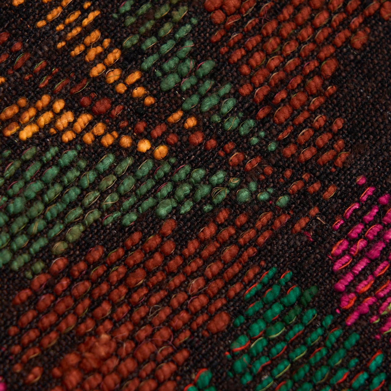 真綿紬のふっくらとしたいろいろな色の糸が少しだけ縦にシュッシュッと織り込まれた黒の地に、お太鼓には大胆な調子に大きなお花が咲いている様子が、濃紅色や亜麻色、焦げ茶色や鉄色などの糸に金糸も交えながら、それを絶妙に使いこなされて、ボリュームたっぷりに織られたとても素敵な八寸名古屋帯です。