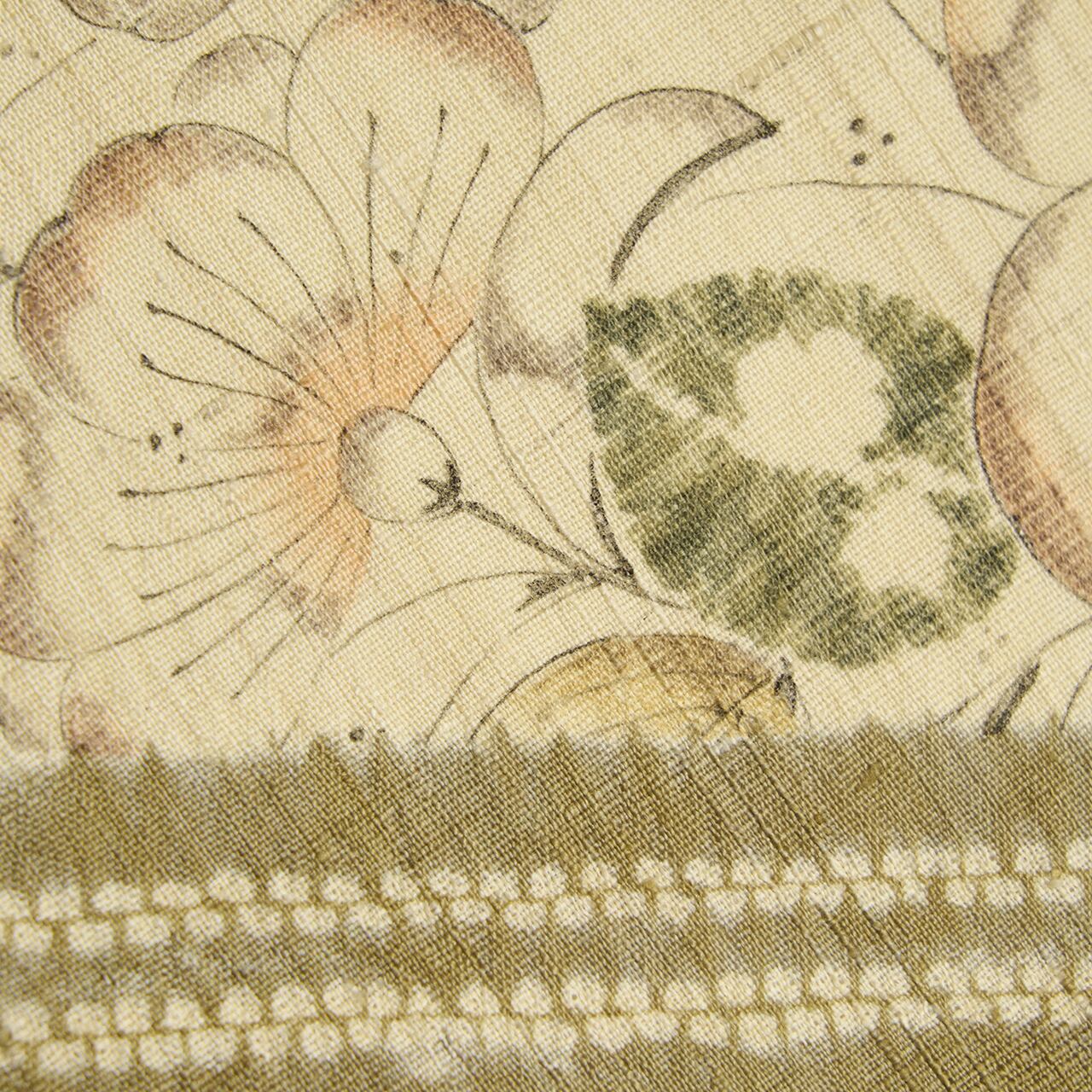緯糸に節のある座繰りの紬地が、濃いモスグリーン・仙斎茶色に染められ、お太鼓やその下のタレの方は、岩井茶色の渋めの草色と練色のベージュに斜めの線で絞りで染め分けられ、練色の部分には墨書きで椿や桜のお花などが描かれて、部分的にさりげなく獅子色のピンクや柳煤竹色のグレーなどの彩色がされた、辻が花染めの素敵な九寸名古屋帯です。