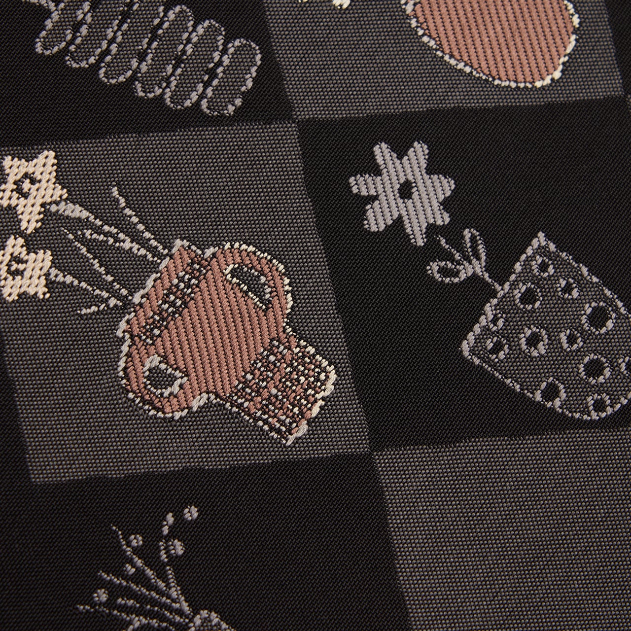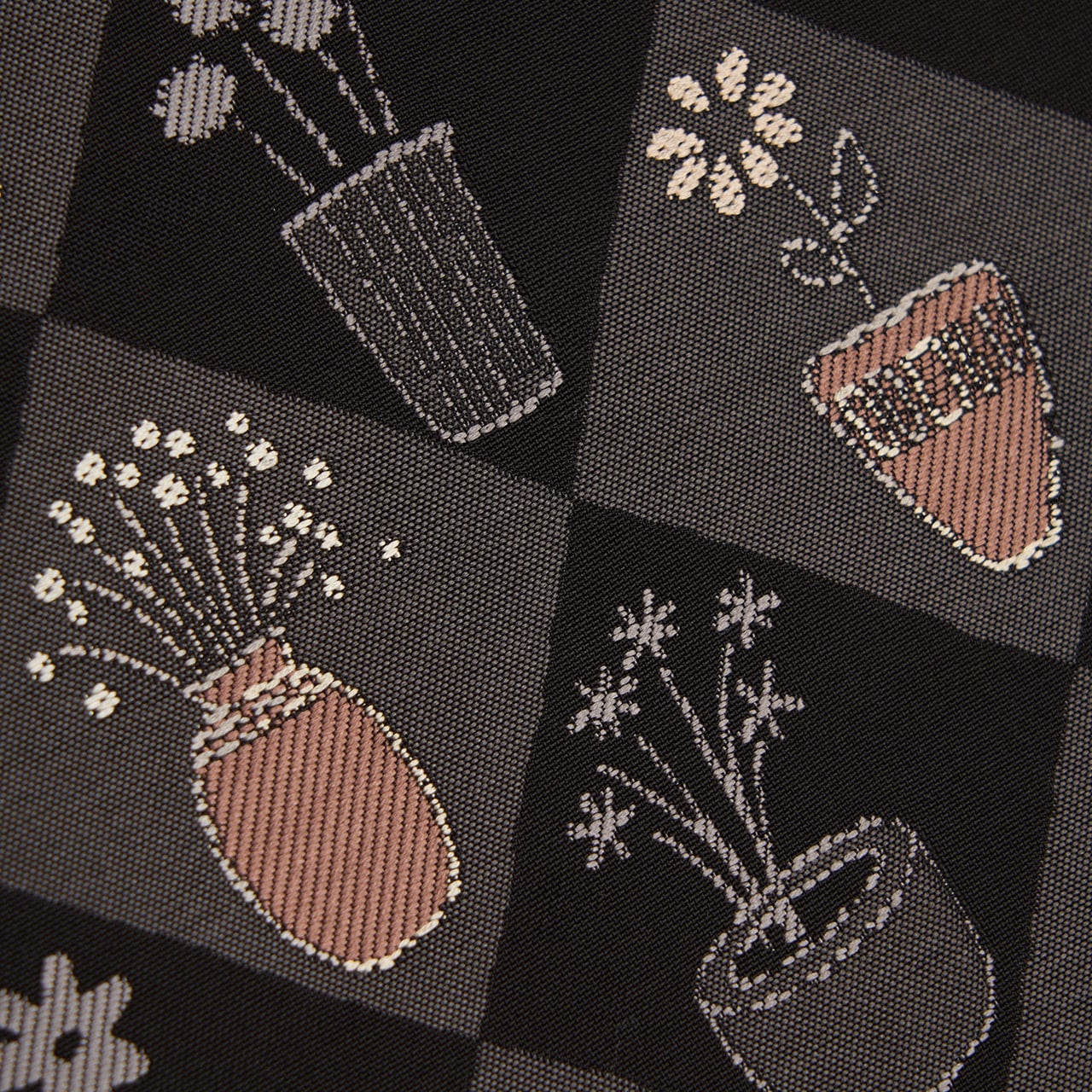 博多織ならではのシャリっとしたしなやかな織りの黒の地に、お太鼓には鈍色の濃いグレーの四角で斜めの市松が取られ、それぞれにいろいろな形の花瓶にいろいろな形のお花が生けられた模様が織り出された、のどかな雰囲気に可愛らしさもある素敵な九寸名古屋帯です。