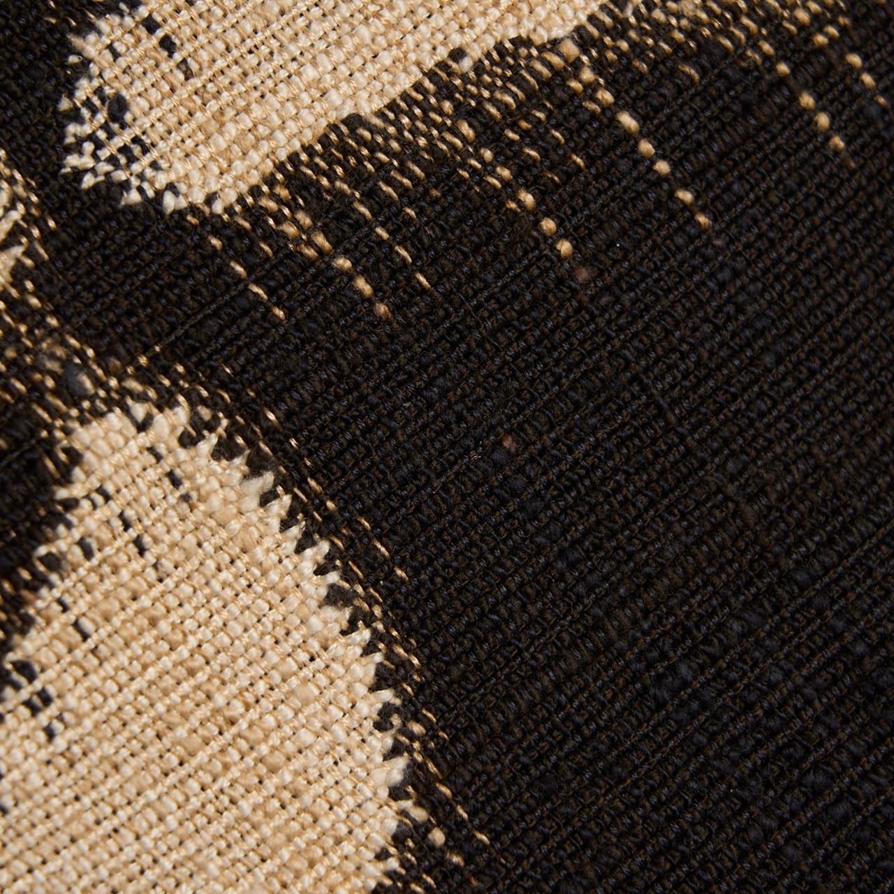 お太鼓の柄を境に、練色のベージュと黒で織り分けられていて、そのお太鼓の部分には抽象的なデザインのお花が元気の良い雰囲気ですくい織で表されています。