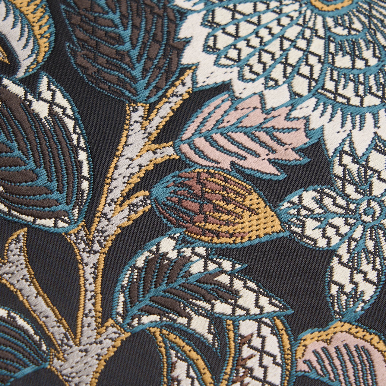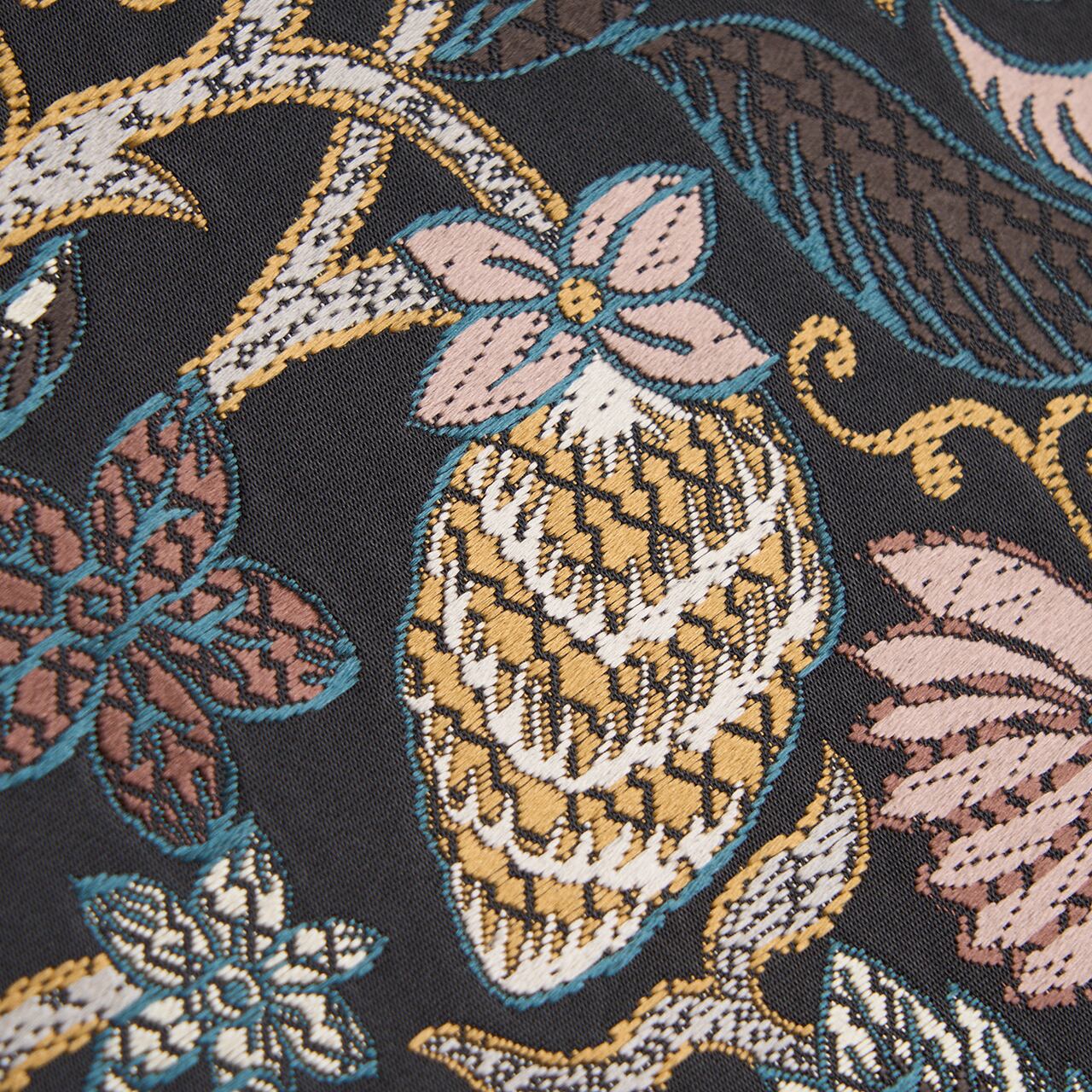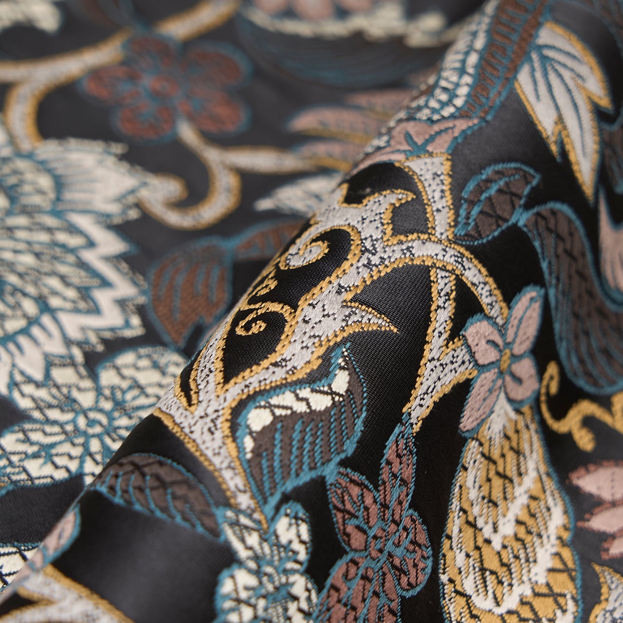 地色が黒地ではなく、藍味のある濃いグレーとなっているのがまたお洒落さを醸し出していて、潤色や枯野色のニュアンスのある淡いグレーの糸が、唐織のようにふっくらと織り込まれているのもとても魅力的です。