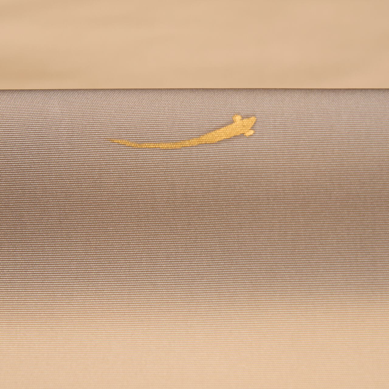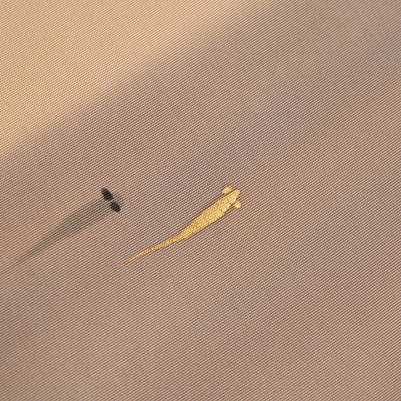 オレンジ味のある淡い薄茶・薄卵色のしっとりとした塩瀬の生地のお太鼓に利休白茶色の段が暈しで染められ、そこに泳ぐメダカの姿が黒と金で手描きされた、可愛らしい印象の素敵な九寸名古屋帯です。