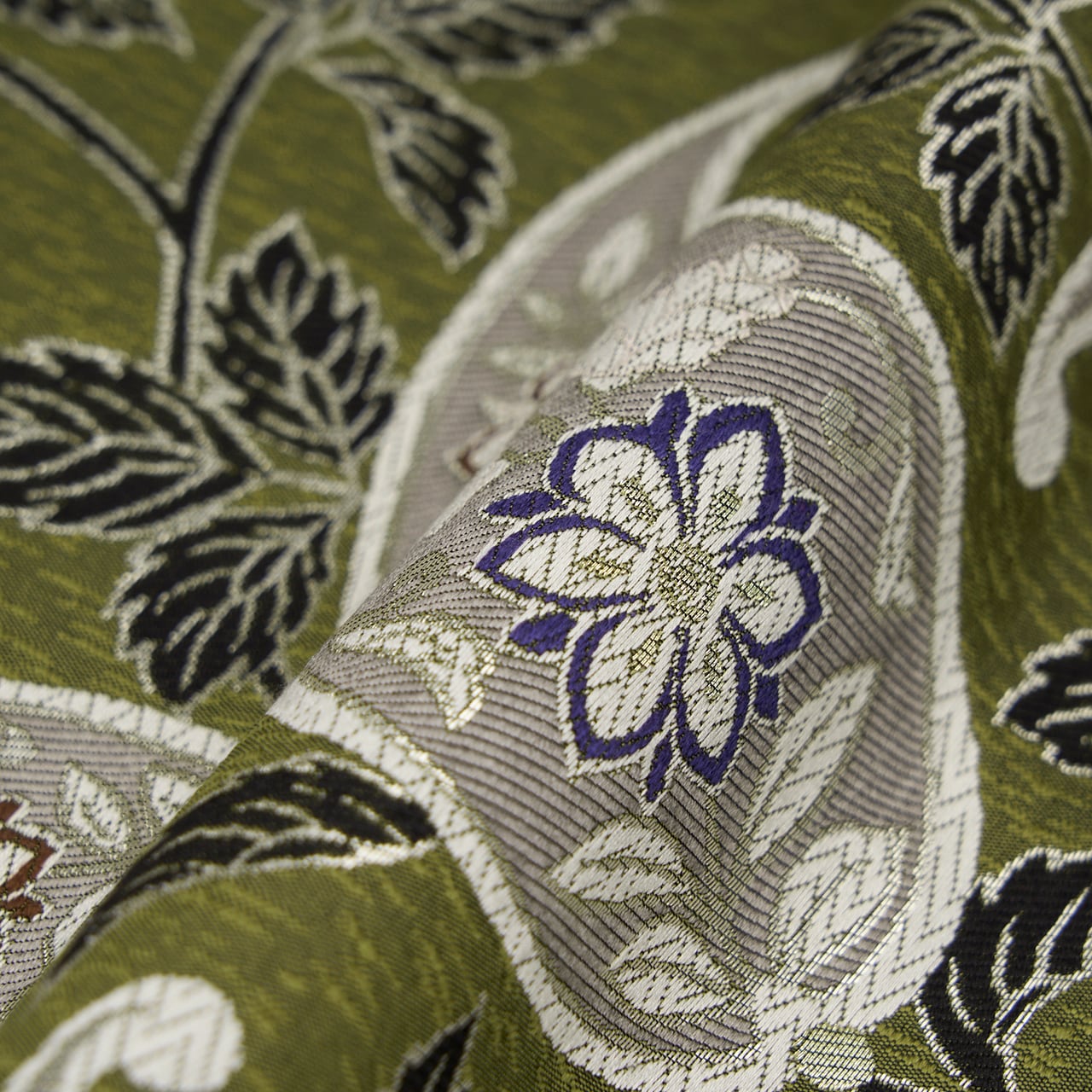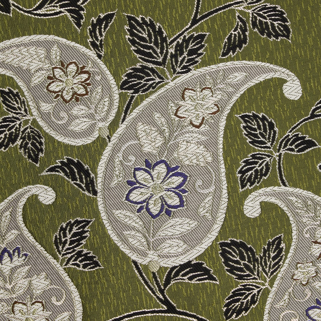 しっとりとした質感に織られた地に、ペイズリーの模様が白く美しく際立っていて、それを取り巻くような蔓草の模様も黒に銀の縁取りで清々しくキリッとした雰囲気になっています。