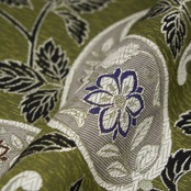 木肌のような、雨縞のような縦縞の点々の地紋のある、渋めの緑・山鳩色の地に大小のペイズリーが潤色の糸で織られ、その中には白い花唐草の模様が織られ、お花は憲法色と褐色で縁取りをされて、さらにペイズリーのまわりには蔓草の模様が黒と銀の糸で織り出された、メリハリの効いたお洒落な袋帯です。