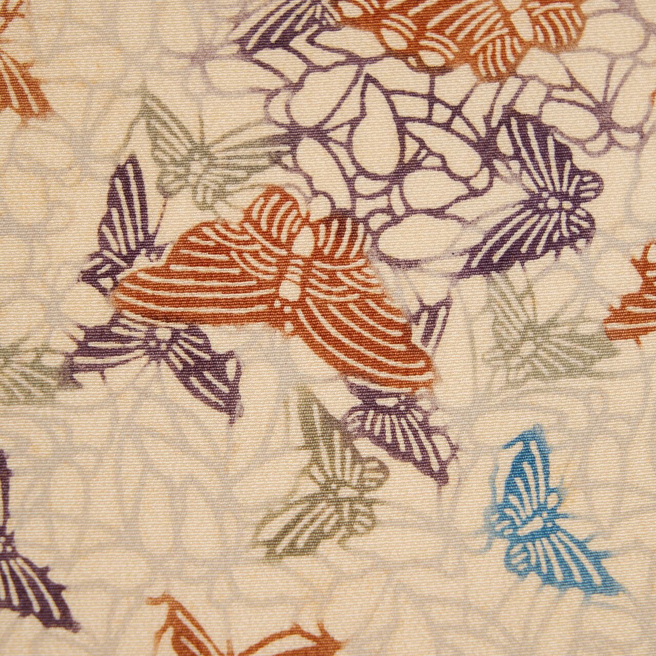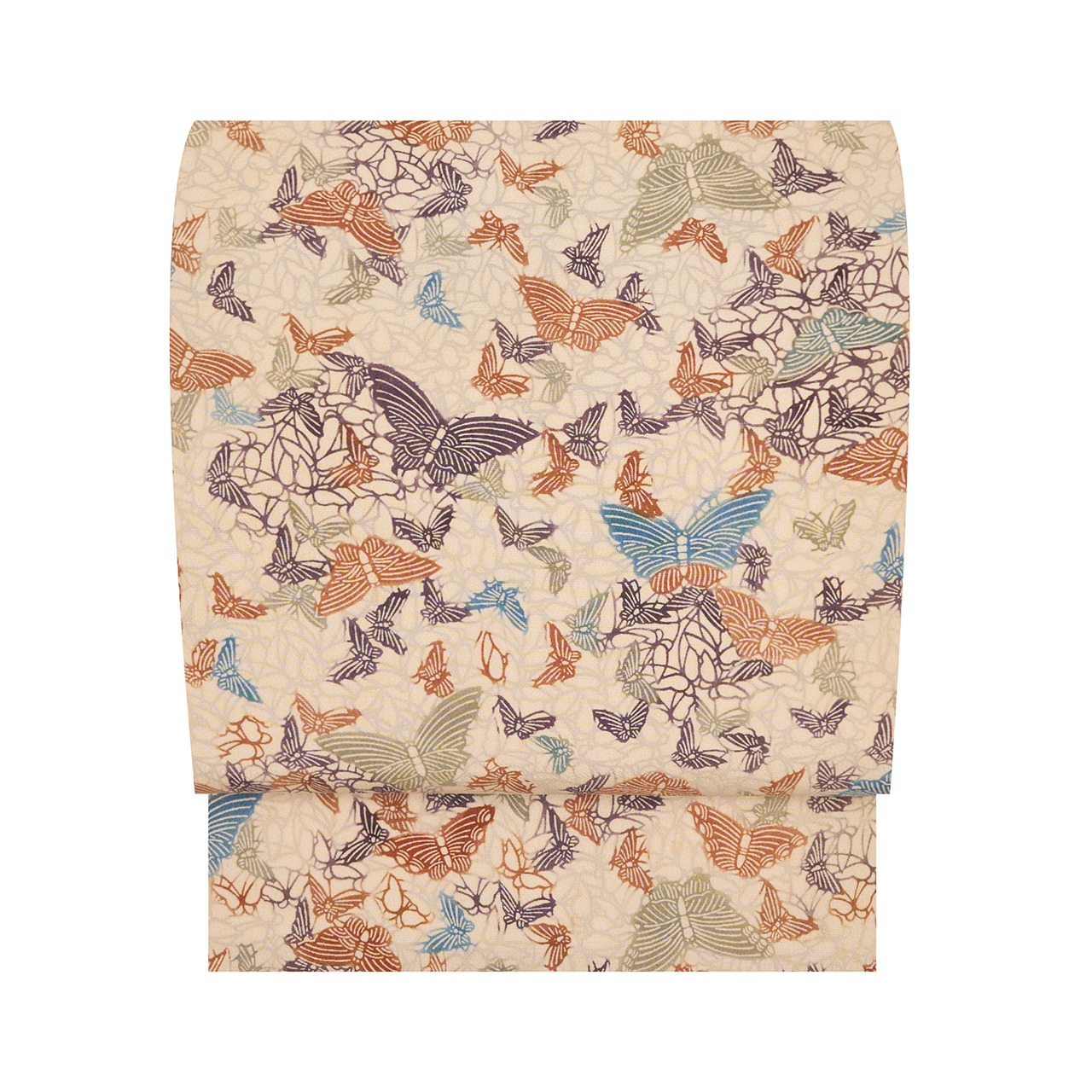 白汚しのようなベージュ味のある生成り色・灰白色の一越ちりめんの生地に、淡く白っぽいグレー・潤色で小さな蝶々がびっしりと地模様のように染められたものを背景にして、灰茶色や利休白茶色のグレー、紺鼠色、似せ紫などの色で、大小の別の形の蝶々が型絵染めで染められた、幻想的な雰囲気もあるような、お洒落な九寸名古屋帯です。