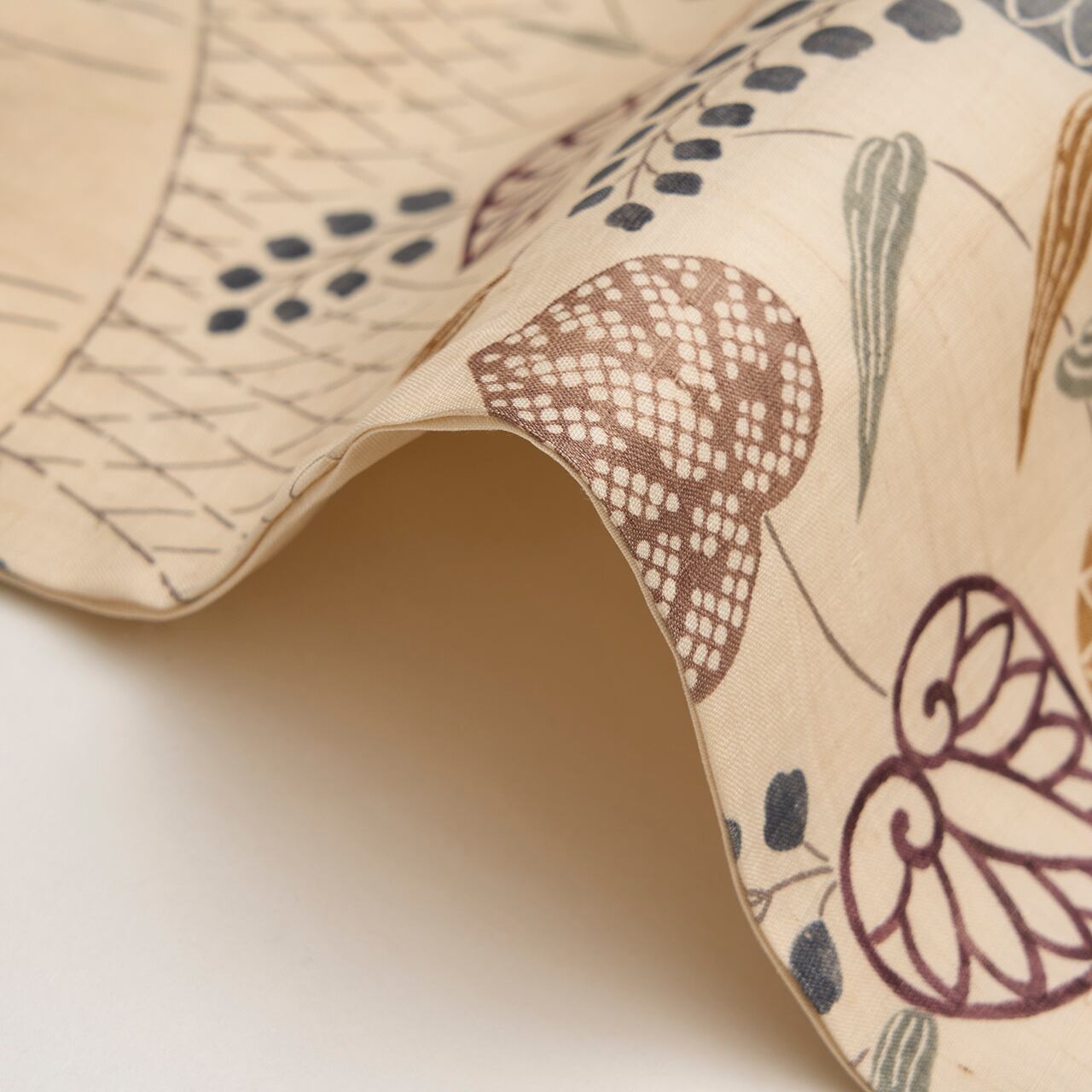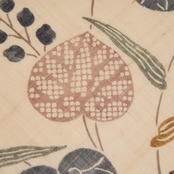 葵の葉は、柴染色の薄茶、薄鈍色のグレー、葡萄色の臙脂、藍墨茶色の濃いグレーなど、いろいろな色で染められていて、リズミカルで華やかな雰囲気となっています。