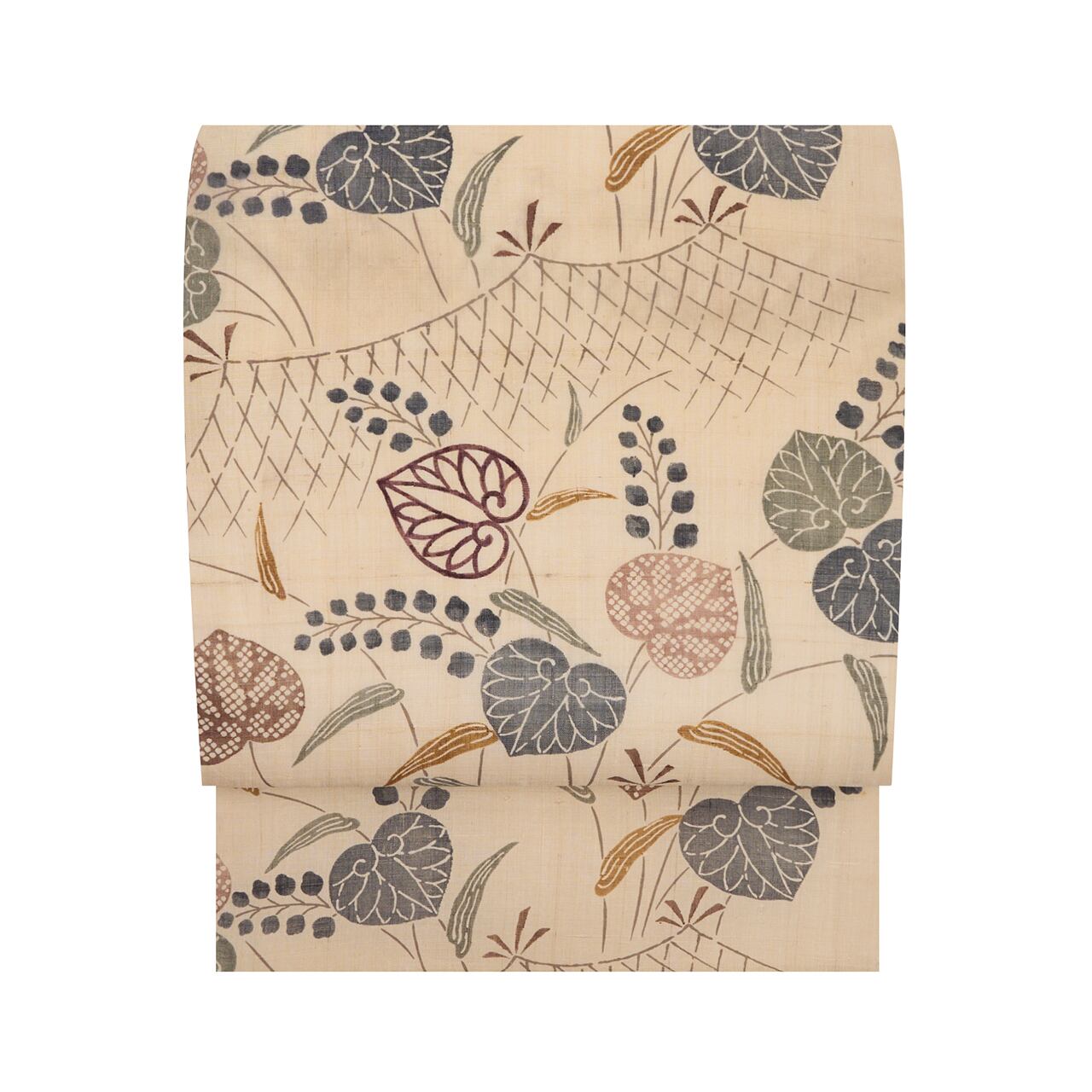 緯糸に節のある、座繰りのシャリ感のある象牙色の生紬の生地に網干の模様が描かれ、そこに笹と葵が生える様子が描かれた、多ち花さんらしいお洒落な九寸名古屋帯です。