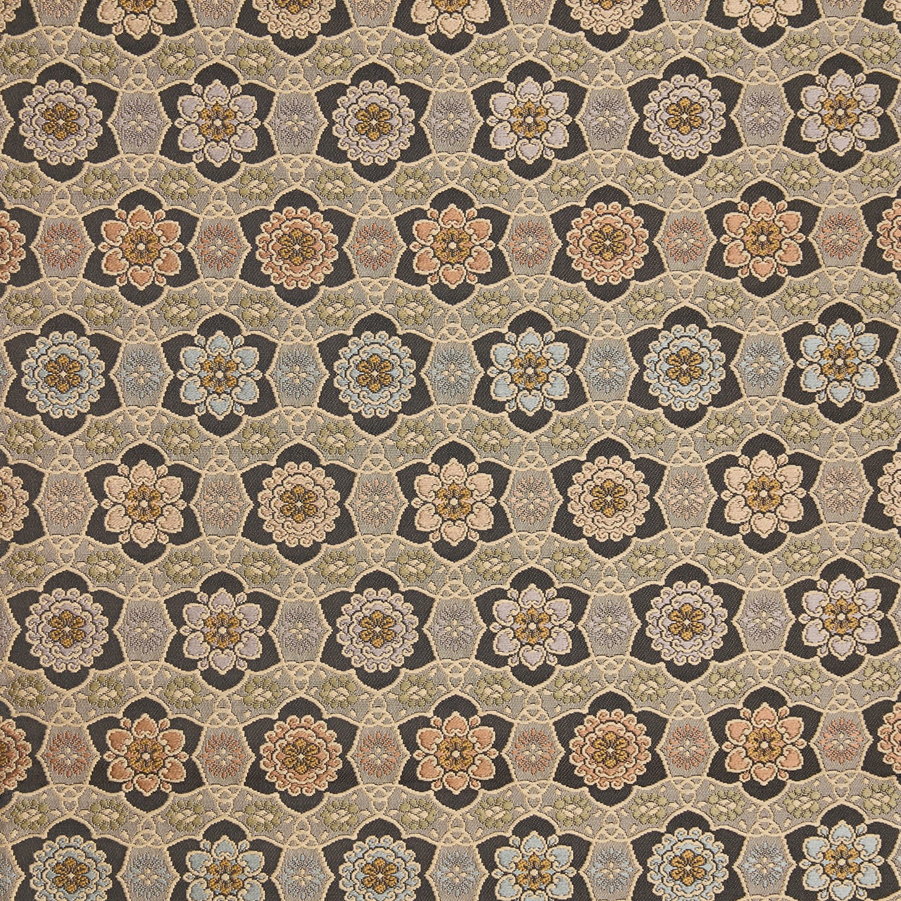 中型の大きさの八陵鏡の模様が、利休白茶色で七宝繋ぎのように連なって配置され、その中に2種類のお花の文様が、灰梅色と秘色色、亜麻色と潤色といった淡い色調の4色で織り出された、名物裂のような格調高さのある箔屋清兵衛ブランドの素敵な袋帯です。