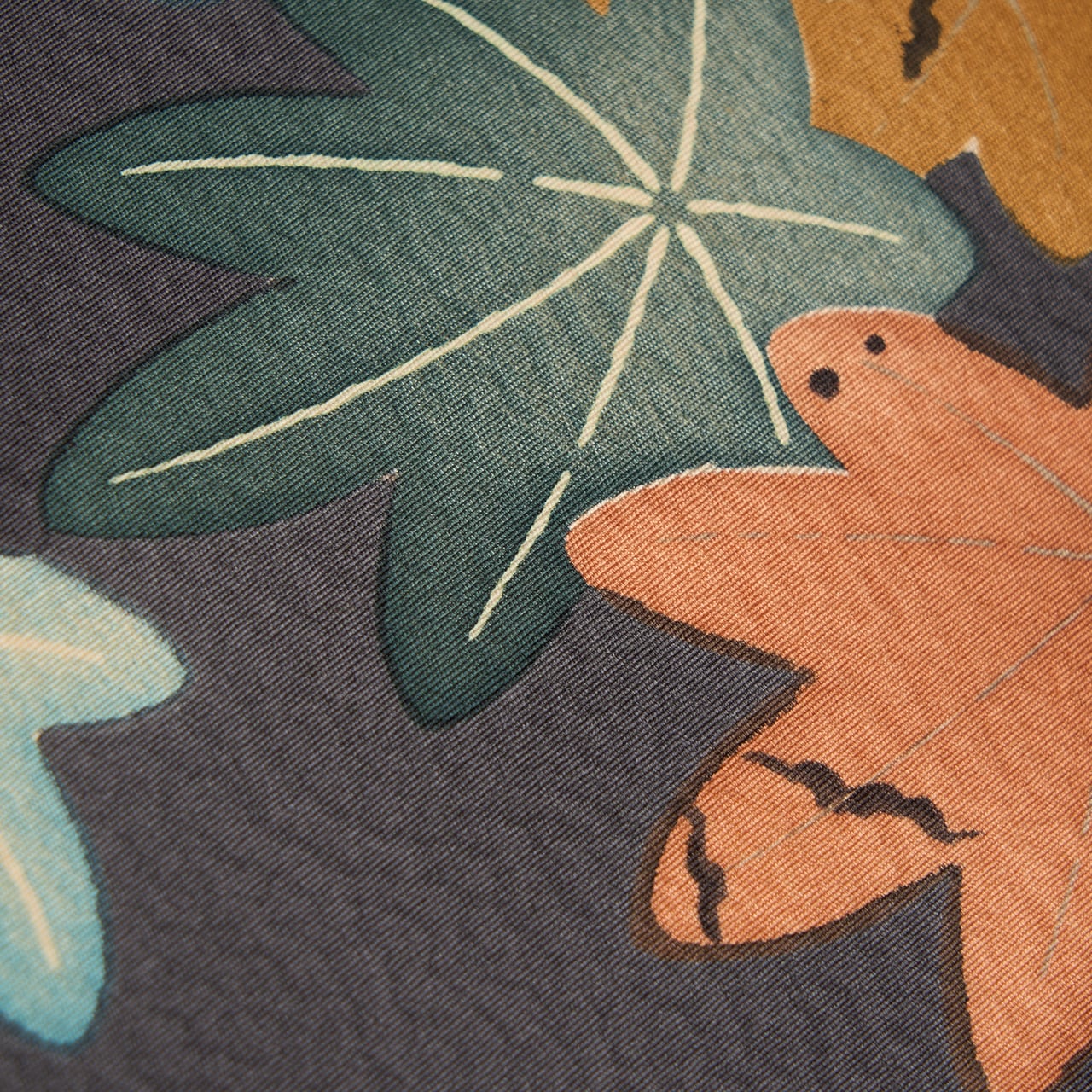 こちらはお太鼓の形になった時にも、青もみじを表したような新橋色とグレーの葉が半分くらいありますので、比較的早い時期からお召しいただけるのではないかと思います。