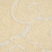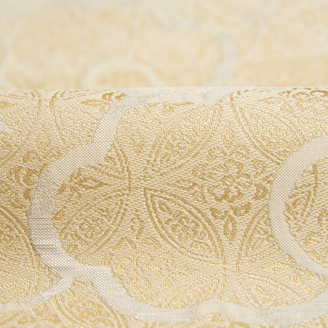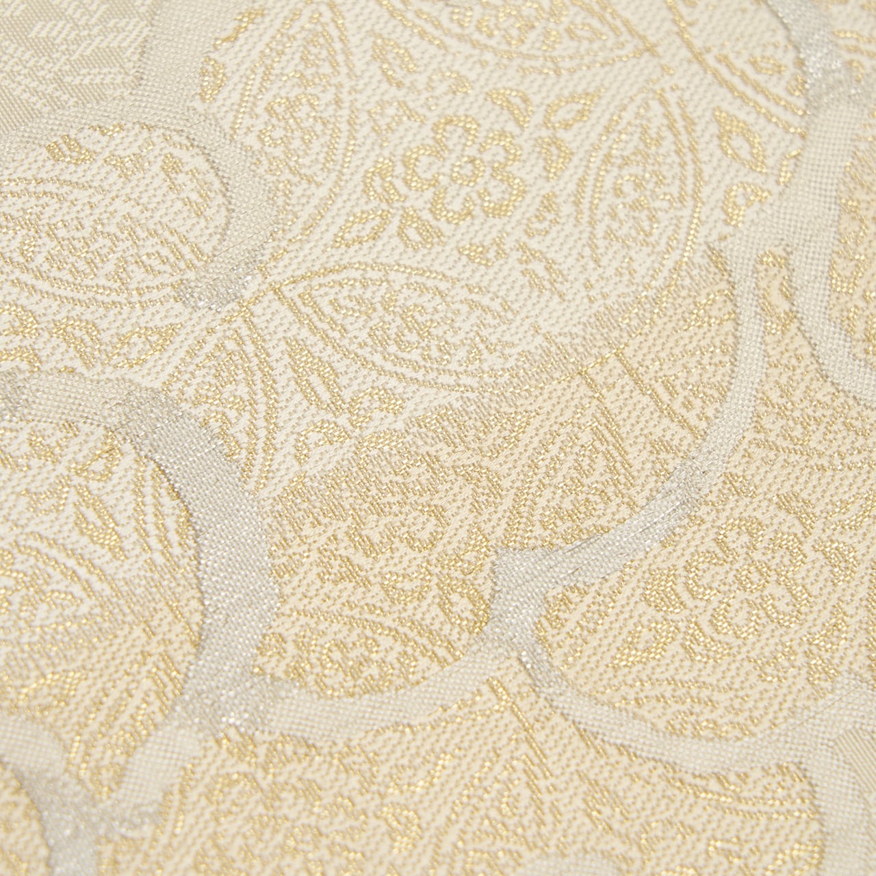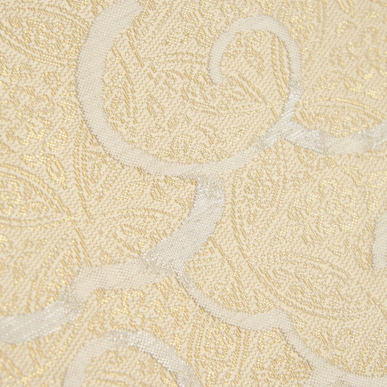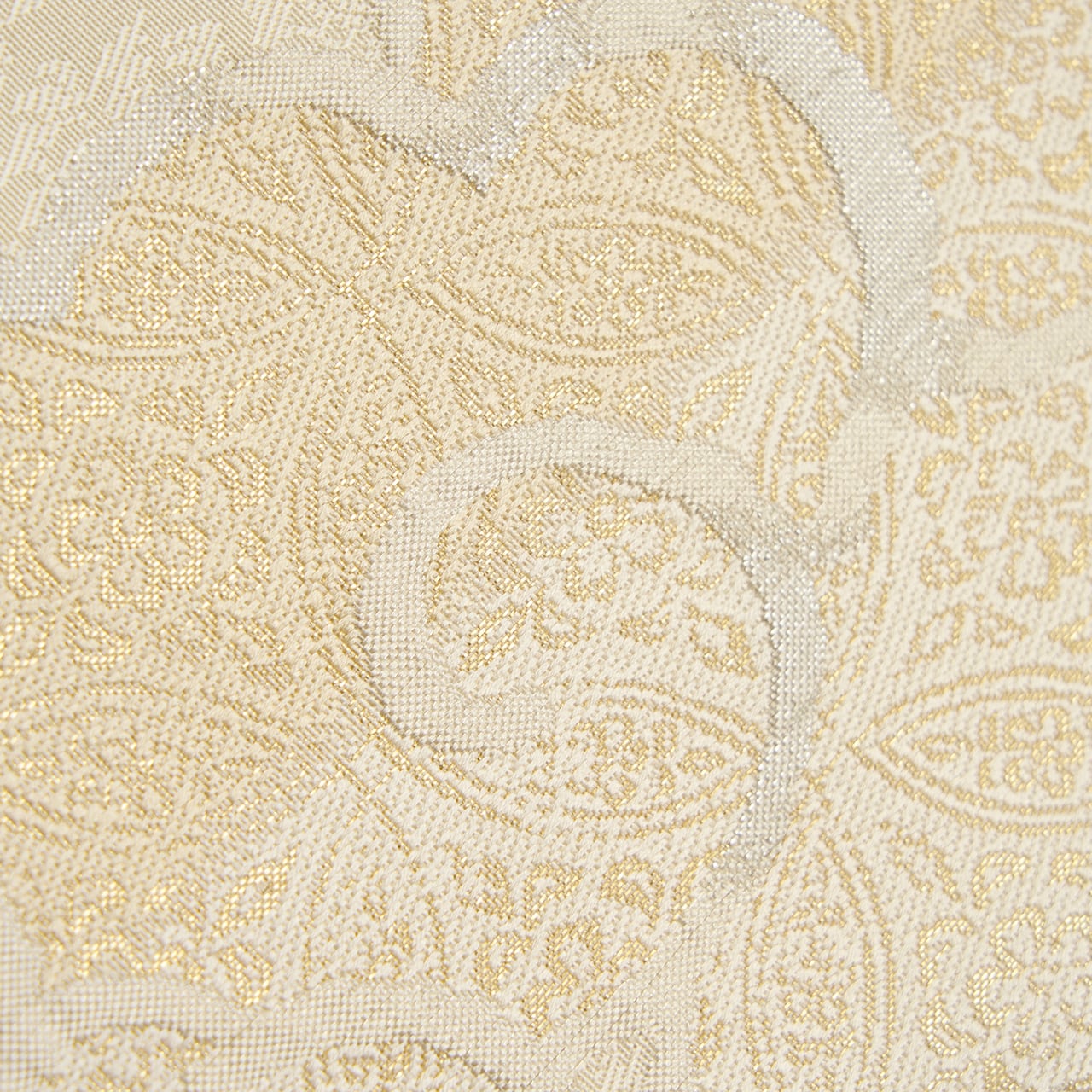 花唐草の地模様のある象牙色の地に、大きな雲の柄が白練色の糸で織られ、その中に極細の金糸で七宝繋ぎに花菱文様が織り込まれた、格調高さのある織楽浅野さんの素敵な袋帯です。