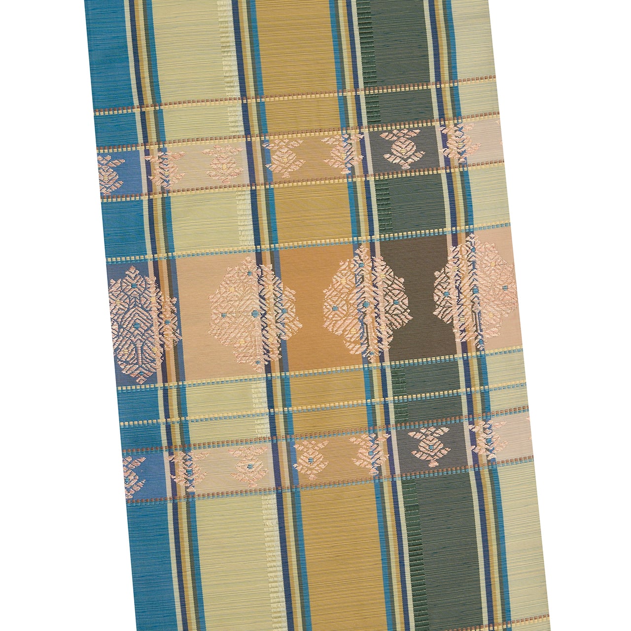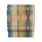間道のように織られた格子は、縦縞の柳茶と革色の部分には真田織のような織りが入れられていたり、横縞の洗柿色の段のまわりには浮織の細い縞が織り込まれていたりと、手の込んだ凝ったものとなっています。